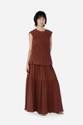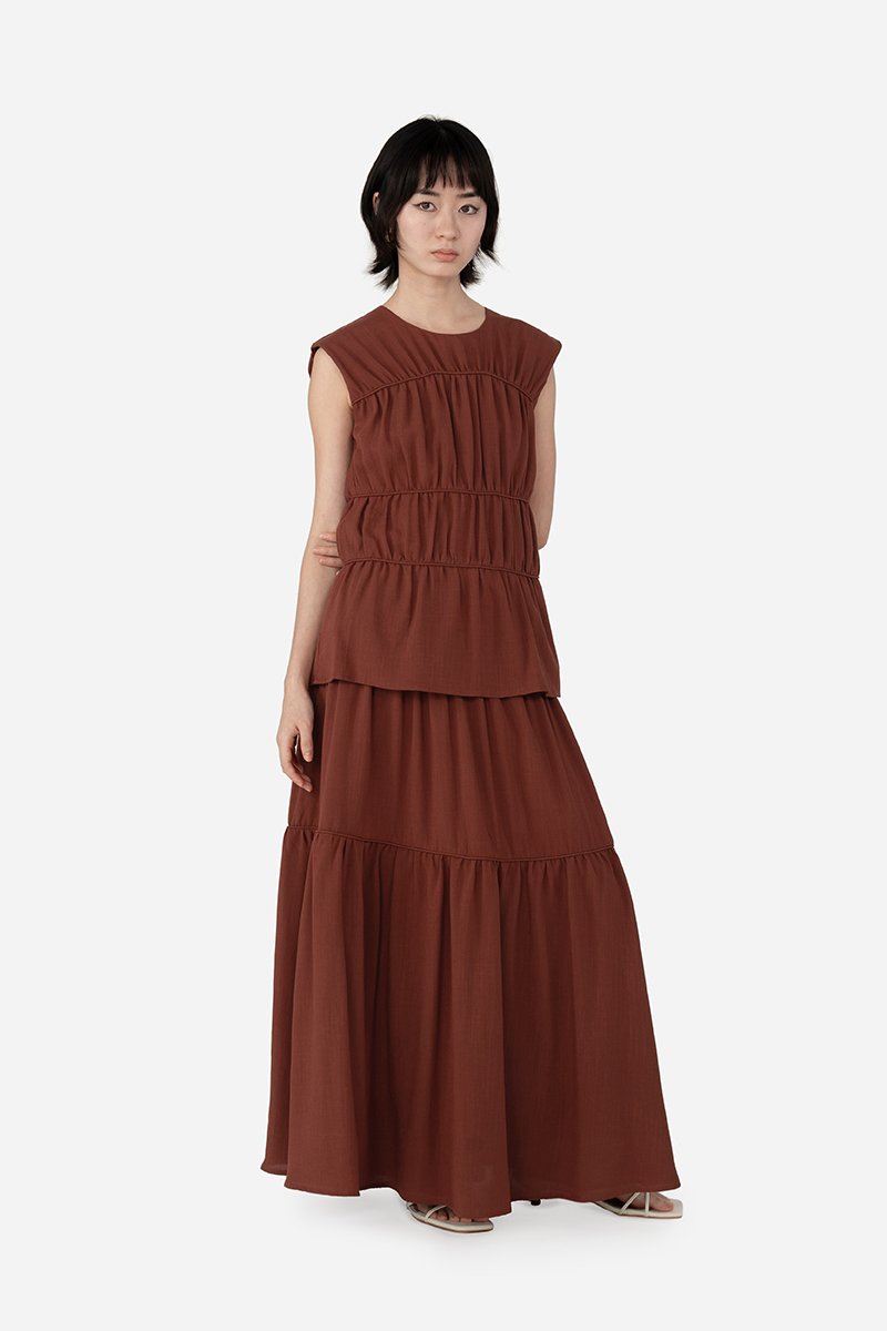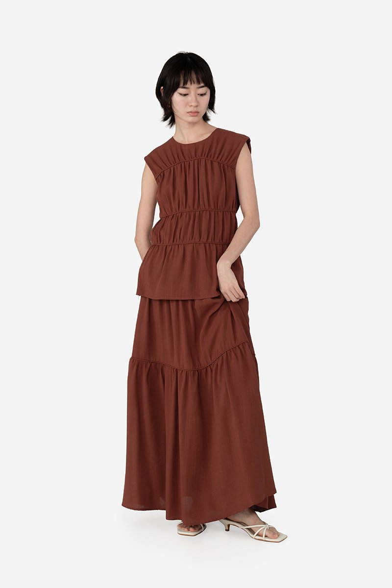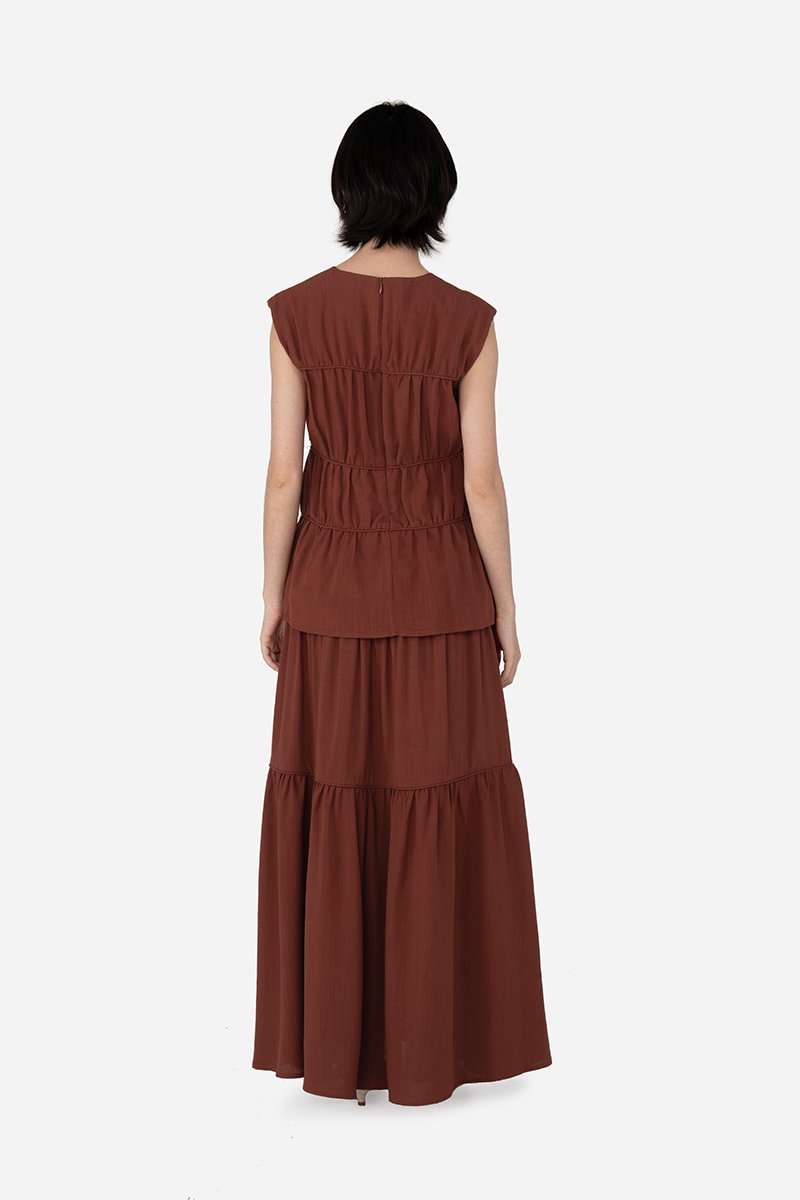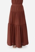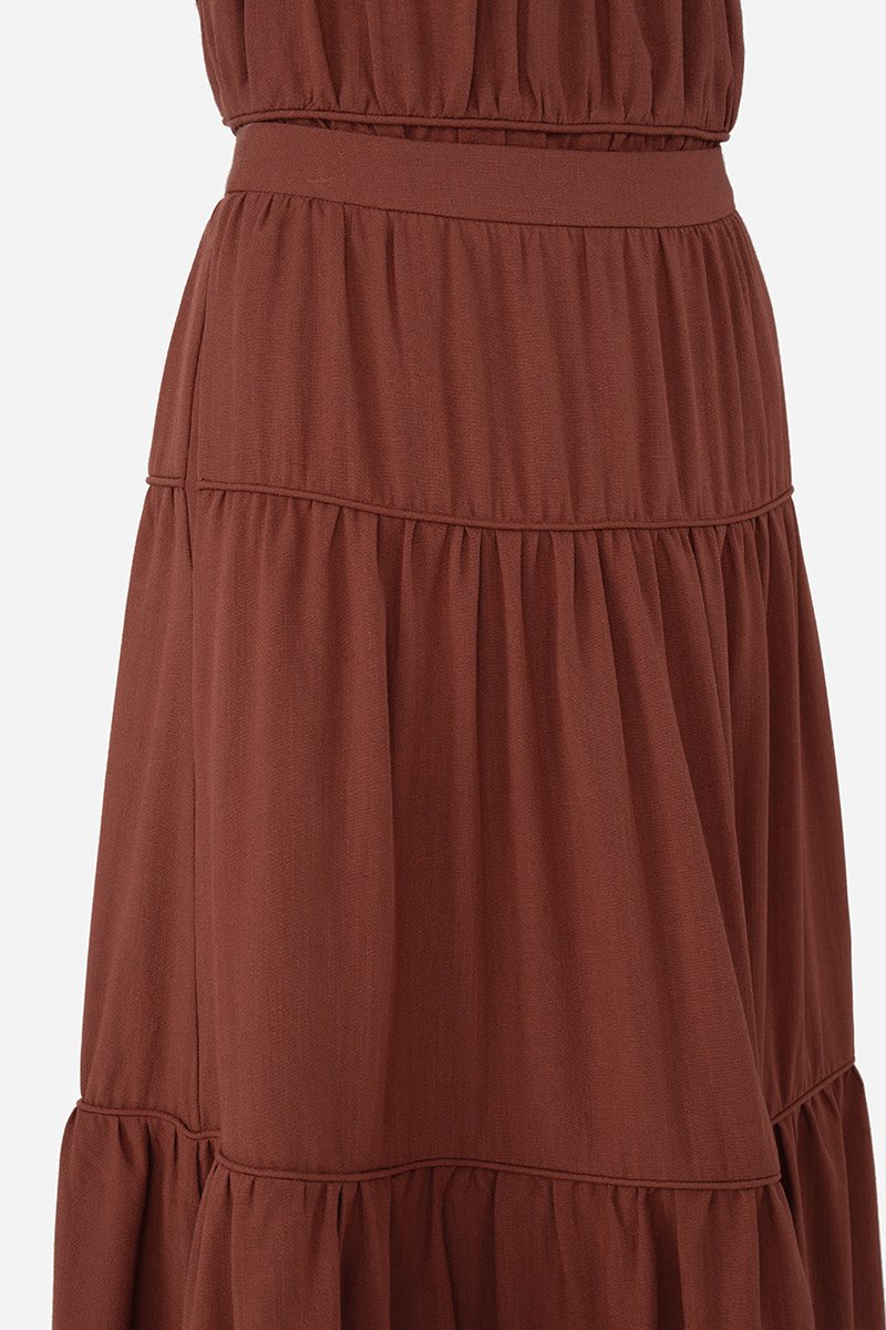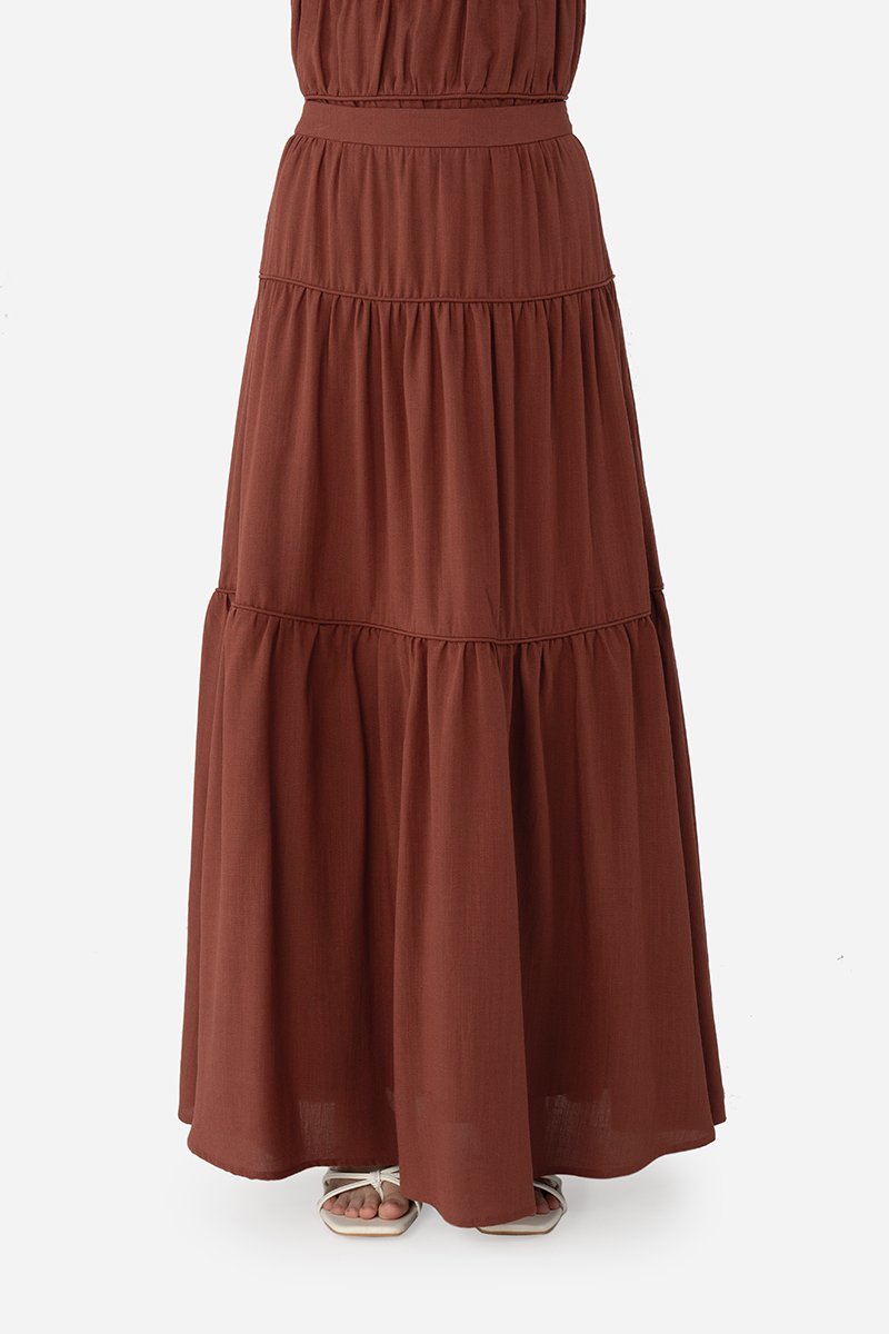Add a statement layer to your outfit rotation with the Imara Skirt, a multi-tiered maxi designed to move gracefully with every step. It features a flowing silhouette with horizontal piping detailing for subtle definition and texture, and a side concealed zipper for a clean finish. Crafted from a soft rayon blend fabric and fully lined with pure cotton, it pairs beautifully with the Dovie, Estel, or Celie for a coordinated co-ord, or can be styled with your favorite separates for versatile, everyday looks.