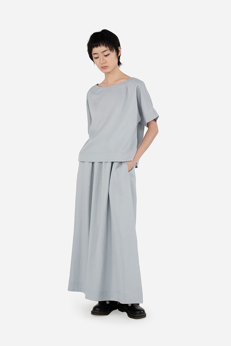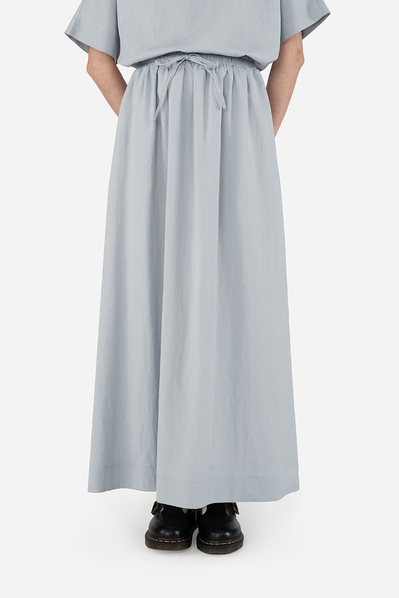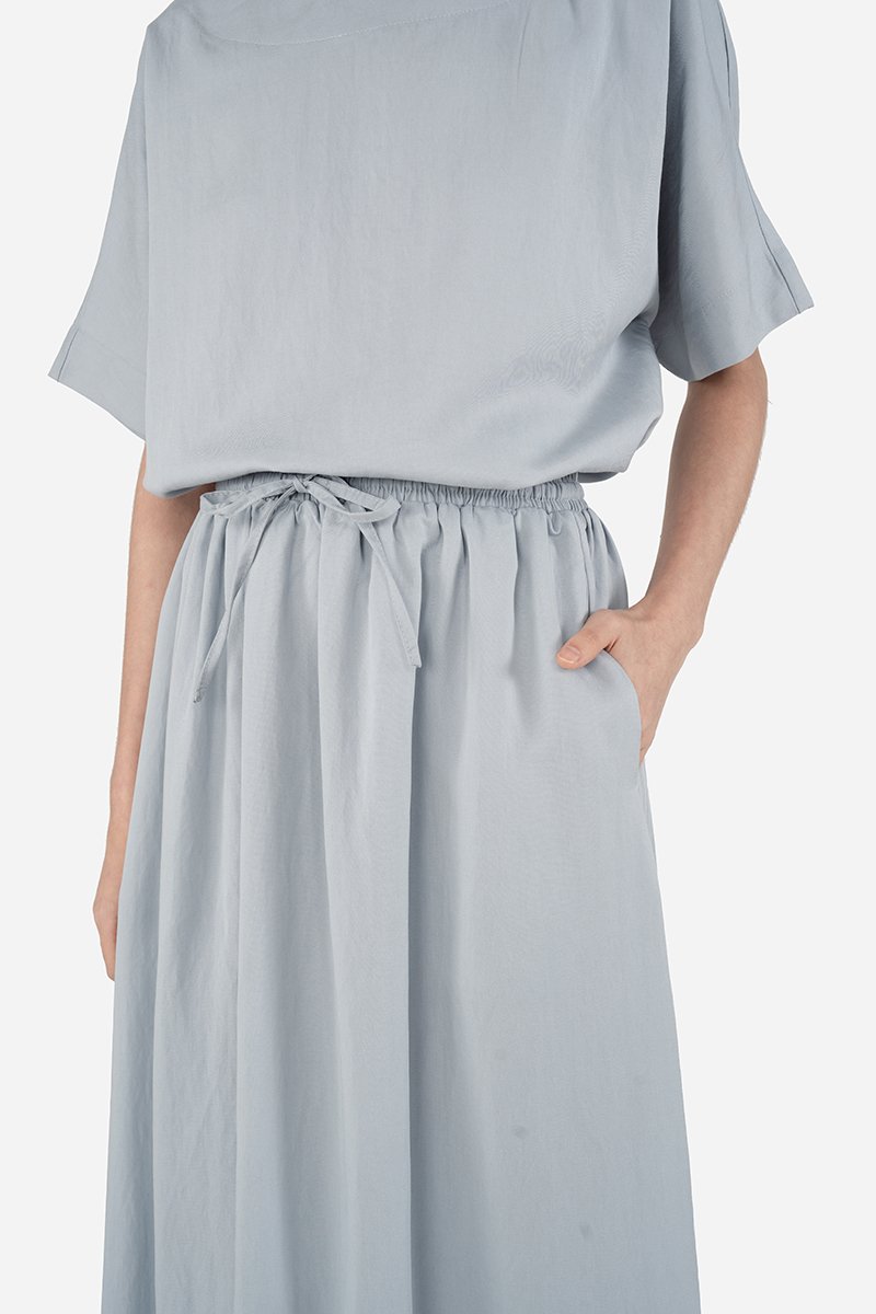 A minimalist essential, Luca blends comfort with understated style. Made in a soft, drapey rayon blend fabric, it features an elastic drawstring waistband, inseam pockets, a thick-stitched hem, and an A-line silhouette for a relaxed yet put-together shape. Styled with the Koru Top, it forms a clean co-ord perfect for everyday wear.
