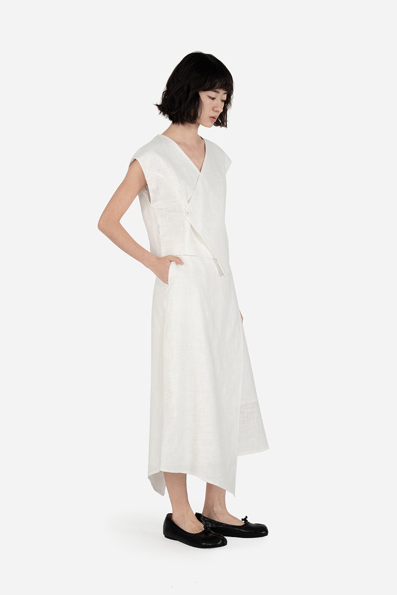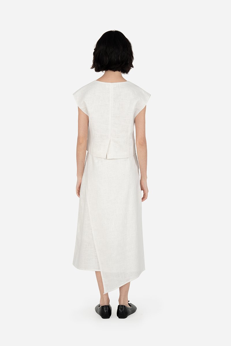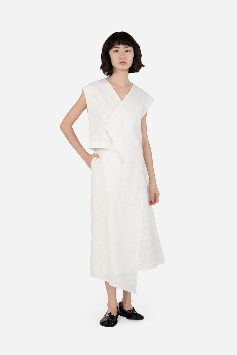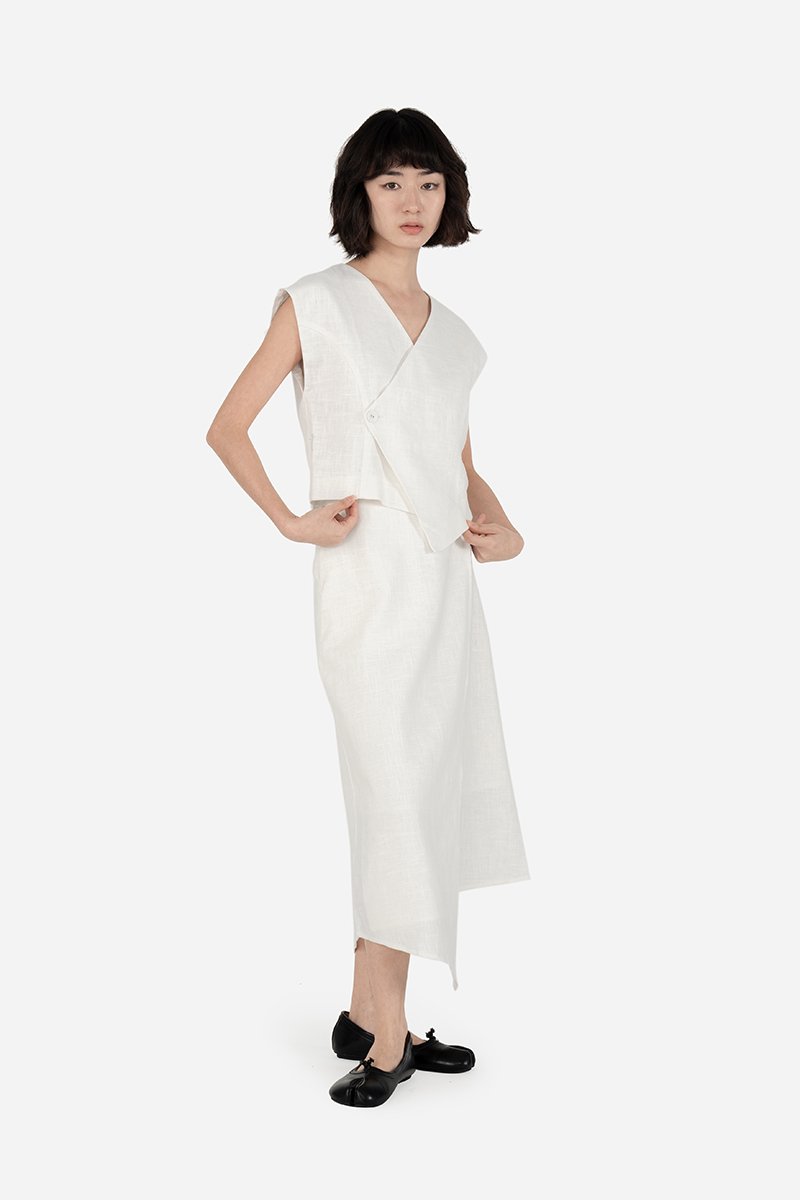 Make an impact dressed in Hayami with its statement look. Crafted from a cotton-linen fabric and put together with a pure cotton lining, this skirt incorporates the Japanese concept of asymmetry with a thoughtfully angled, asymmetrical layer that delivers depth when laid over a classic A-line midi. A single inseam pocket is added to the side without the side zip, and a concealed slit allows for easy movement. Bottom to the set with Haku Vest, Hayami styles well with other tops you own.