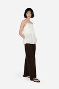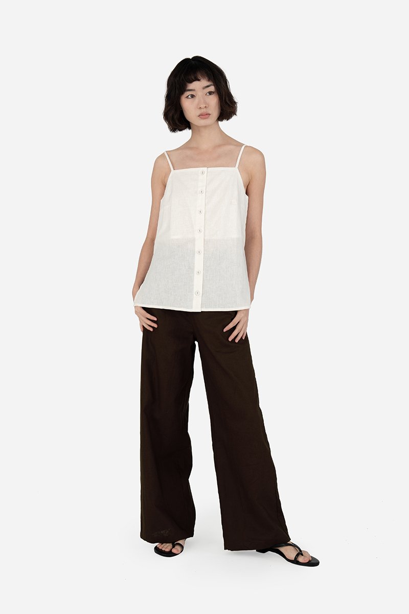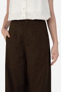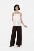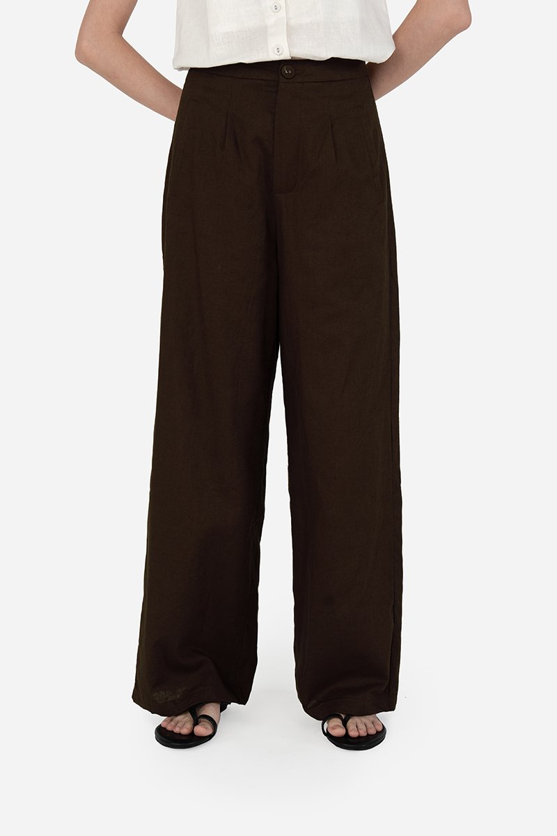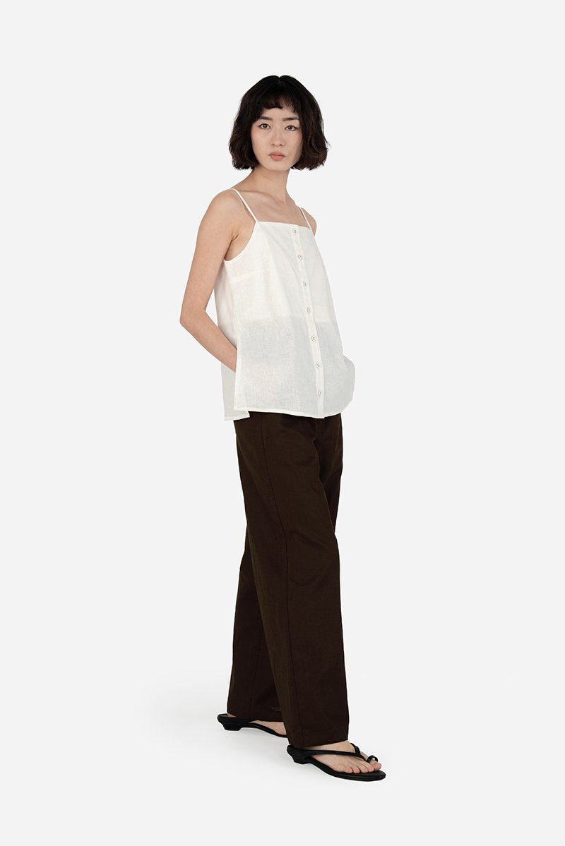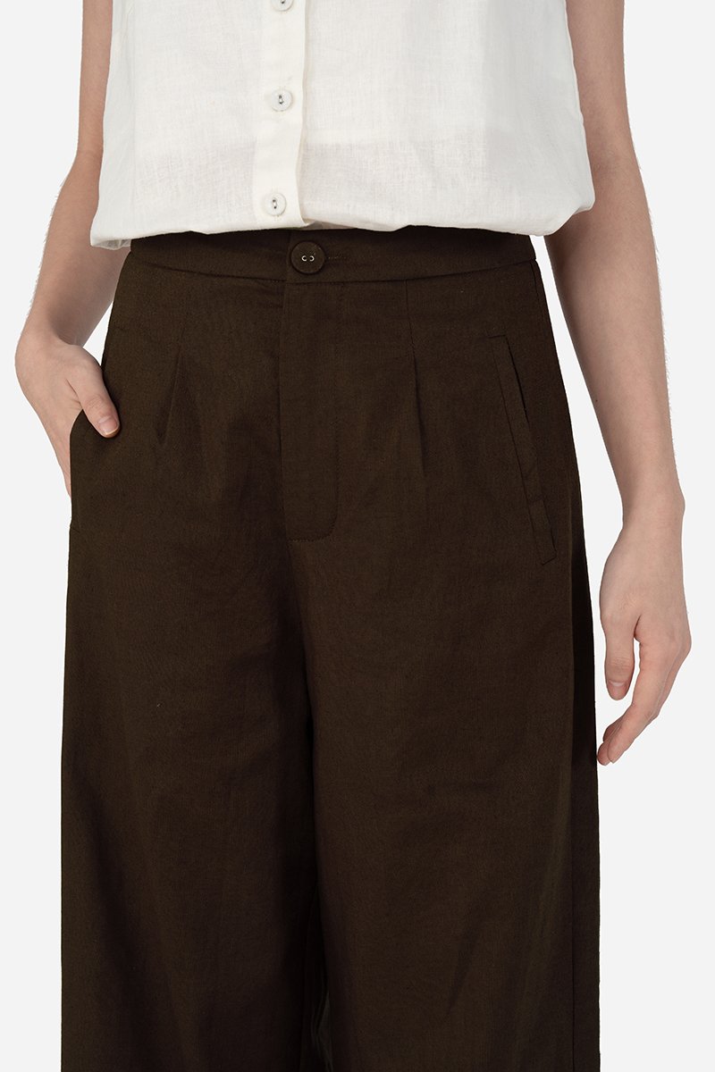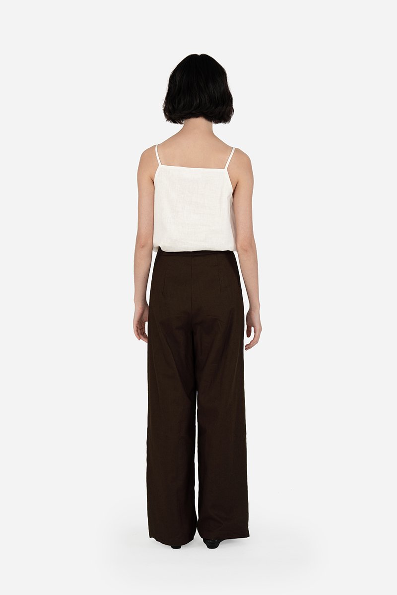 Xyan Pants, a bottom made to deliver a matching fabric set with the Arleen Cami or Zareen Top. Put together with a cotton-linen fabric and pure cotton lining, this standard length pair has a straight-legged silhouette and a front zip and fabric button closure. It features a clean waistband, mini pleat detailing and welt pockets at the front.