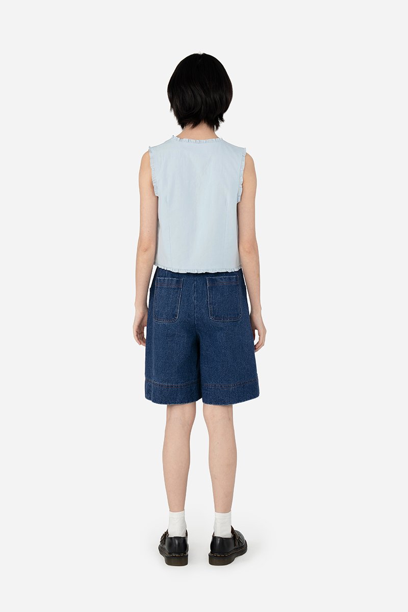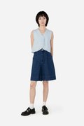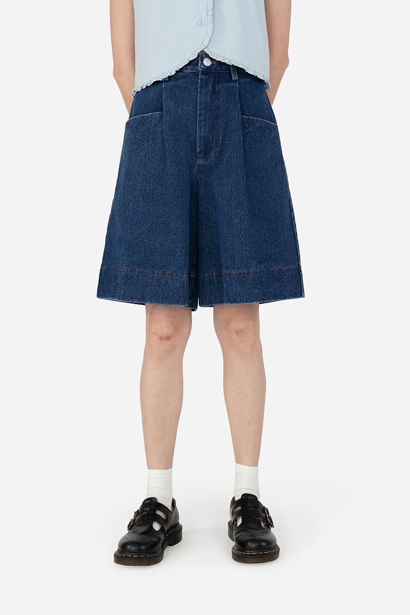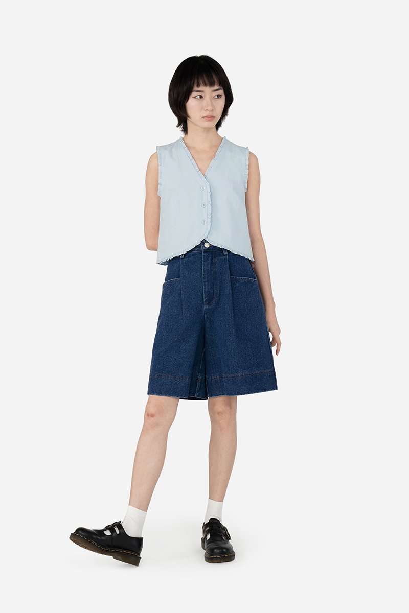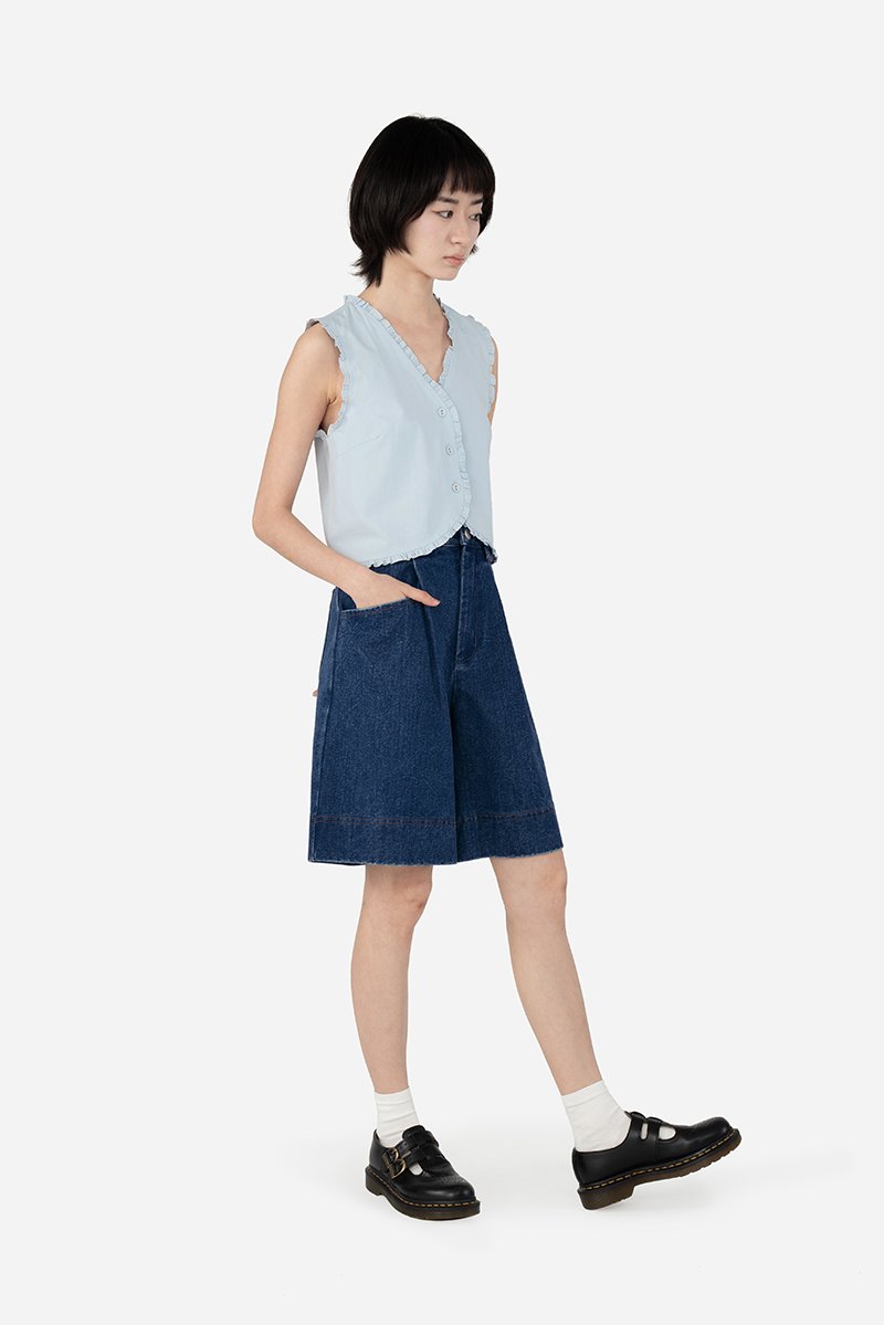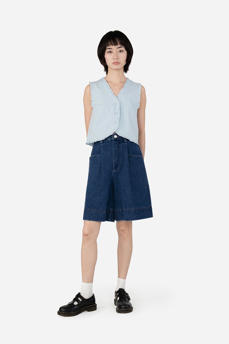 The Ygritt Jorts presents a blend of chic attitude and edgy details, featuring sleek pleated pockets, functional belt loops, and a bold, thick parallel-stitched hem. Easily worn with a front fly and metal button, Ygritt is unlined and made from cotton blend fabric that delivers a structured yet effortless look with a street-ready denim edge.