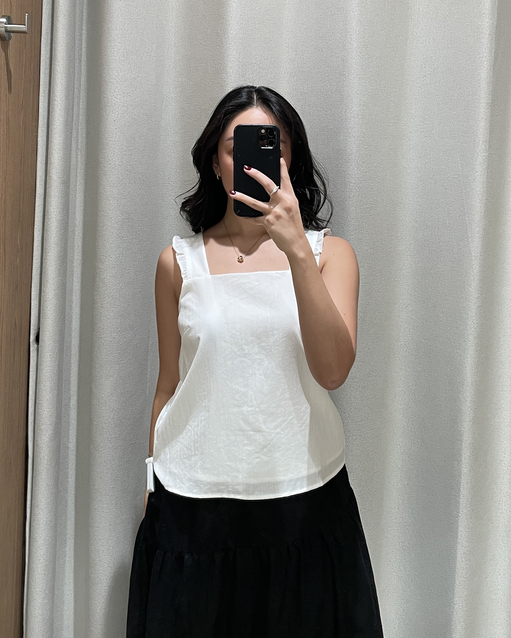 Crafted from rayon blend, the Jenma Top drapes well and feels soft to the touch. It comes lined and features a basic square neckline and thick straps adorned with slight ruffles for a feminine touch. With its versatility, it can be paired with any bottoms tucked in for a finished look, or tucked out for a soft look.