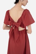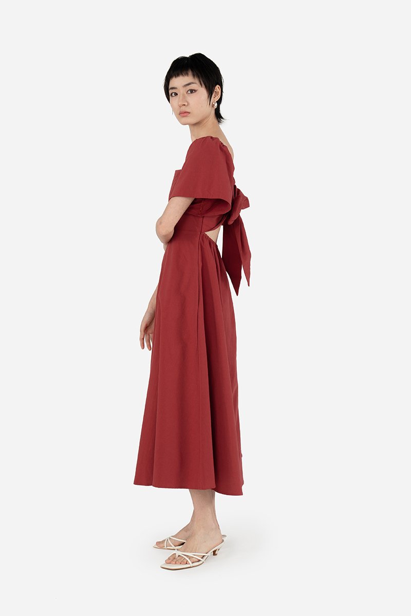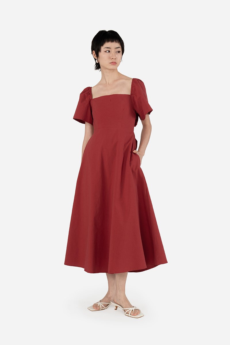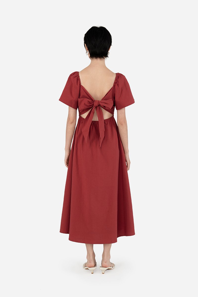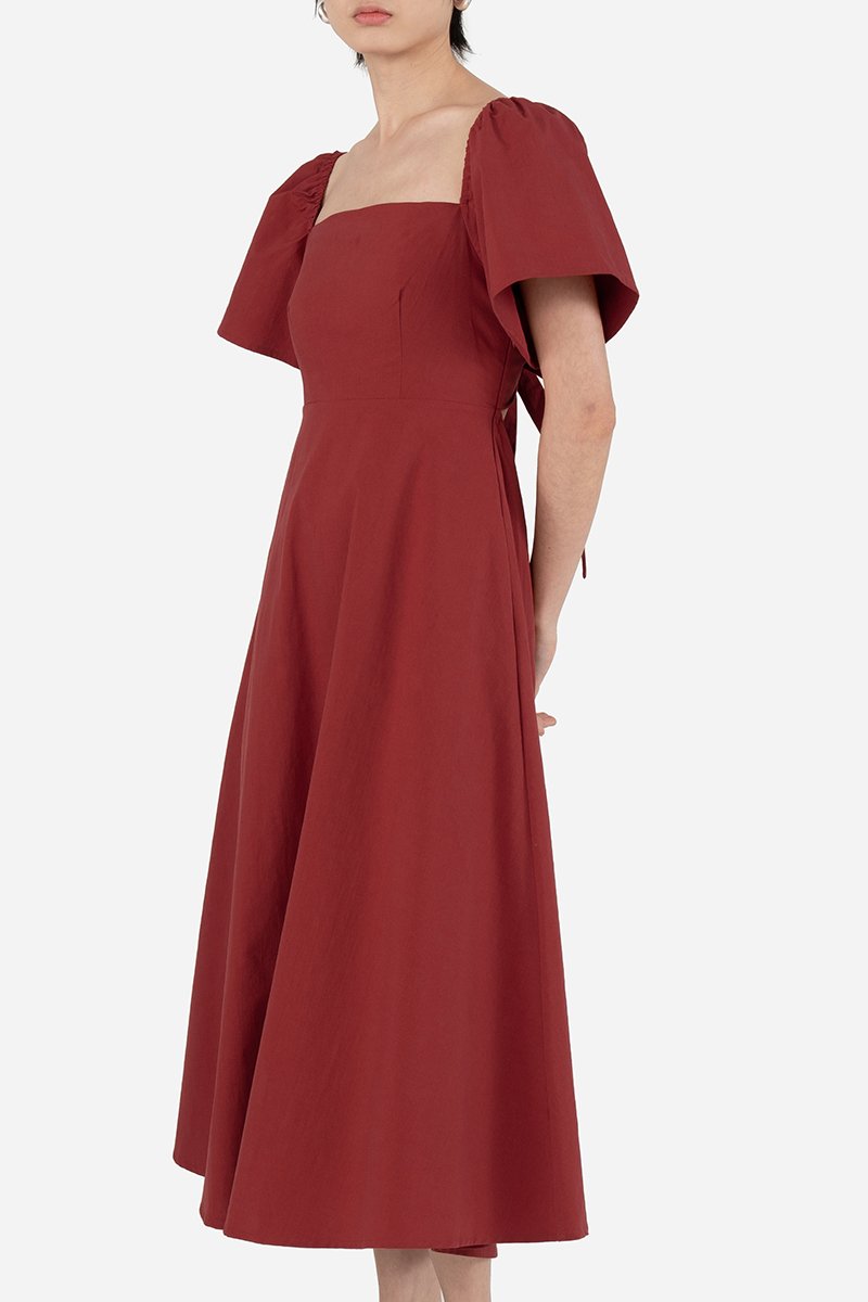 The Amelie Dress is made for the festivities. Elasticized flutter sleeves and a cinched waist with back elastic create a flattering and comfortable silhouette, while the big tie at the back adds a statement-making detail. Crafted in a cotton blend fabric with pure cotton lining and padded with removable cups, it can be worn with or without a bra, with the thick ribbon providing coverage for regular bras. A concealed side zip completes the look, making Amelie perfect for celebrations, date nights, and special gatherings.