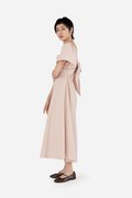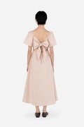 The Amelie Dress is made for the festivities. Elasticized flutter sleeves and a cinched waist with back elastic create a flattering and comfortable silhouette, while the big tie at the back adds a statement-making detail. Crafted in a cotton blend fabric with pure cotton lining and padded with removable cups, it can be worn with or without a bra, with the thick ribbon providing coverage for regular bras. A concealed side zip completes the look, making Amelie perfect for celebrations, date nights, and special gatherings.