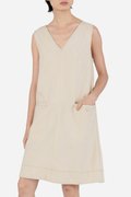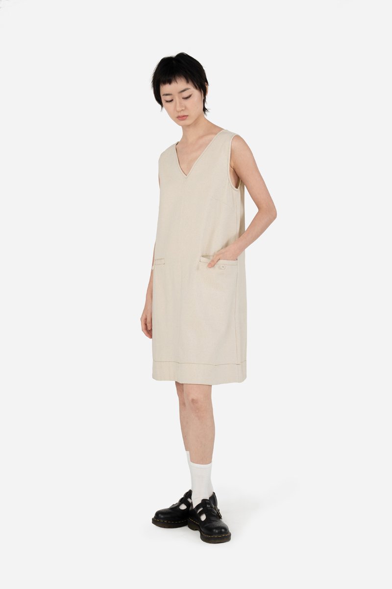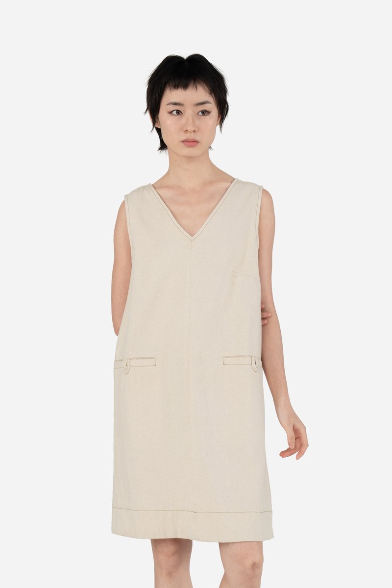 Gretta — a mini swing dress crafted from 100% cotton twill. Designed with a front and back V neckline, and an easy relaxed silhouette, this piece moves comfortably while keeping a clean shape. Finished with contrast stitching and functional welt button pockets for a subtle yet thoughtful detail. Simple and versatile, Gretta makes an easy choice for everyday wear. Pair it with your go-to footwear and accessories for effortless day-to-day styling.