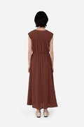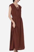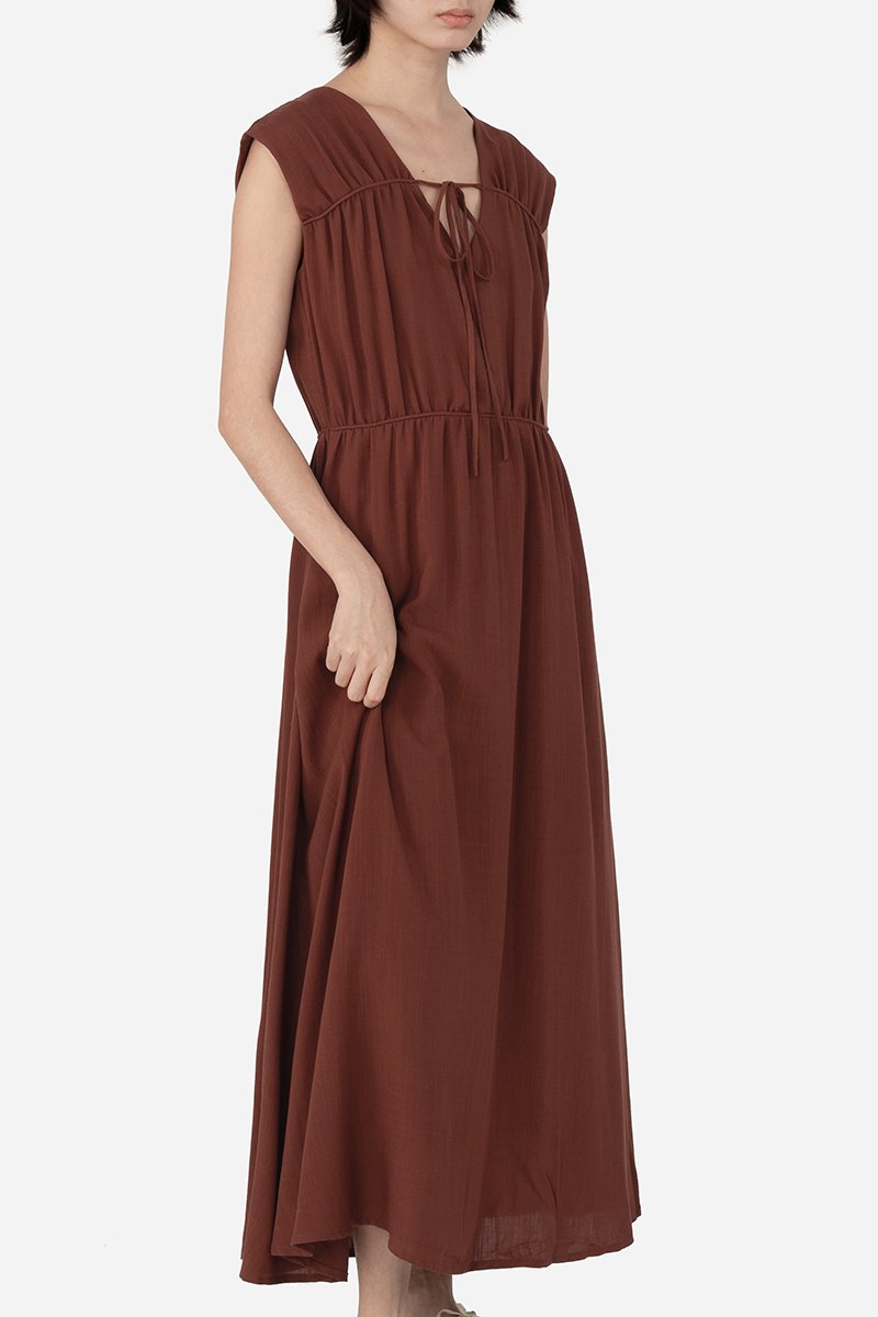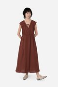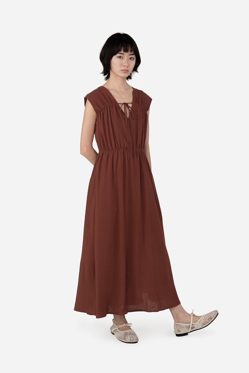 Featuring a V-neckline with horizontal piping and tie-string detailing, complemented by subtle gathered accents for a flattering silhouette, the Hera Dress is crafted from a soft rayon blend fabric and fully lined with pure cotton, keeping you cool and comfortable all day. With a side concealed zipper and two inseam pockets, it’s ready to carry you from daytime errands to celebratory gatherings with ease.