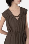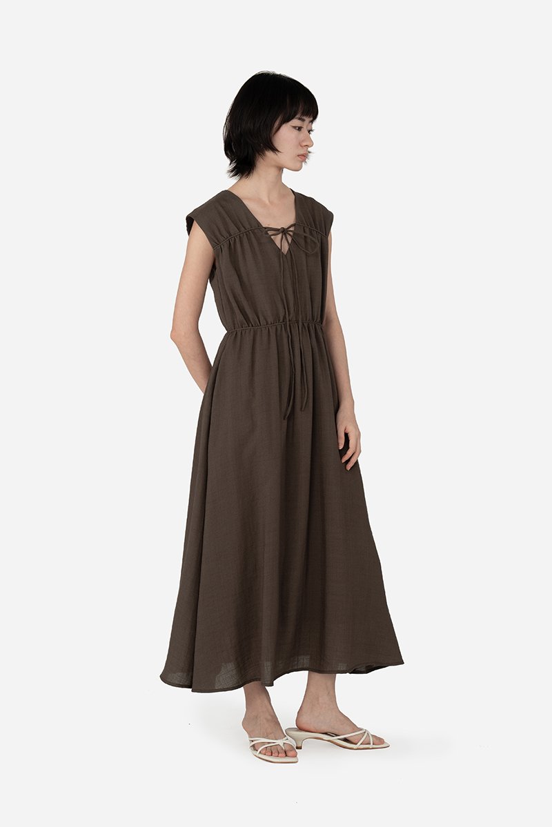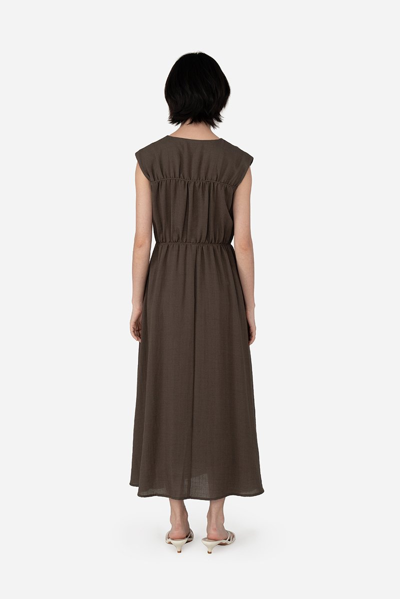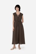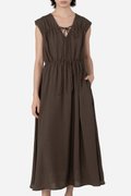 Featuring a V-neckline with horizontal piping and tie-string detailing, complemented by subtle gathered accents for a flattering silhouette, the Hera Dress is crafted from a soft rayon blend fabric and fully lined with pure cotton, keeping you cool and comfortable all day. With a side concealed zipper and two inseam pockets, it’s ready to carry you from daytime errands to celebratory gatherings with ease.