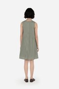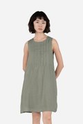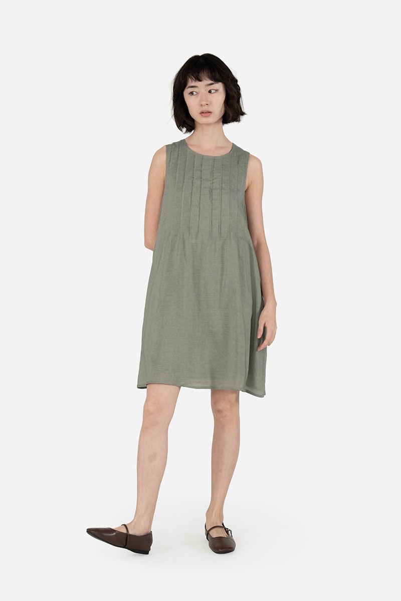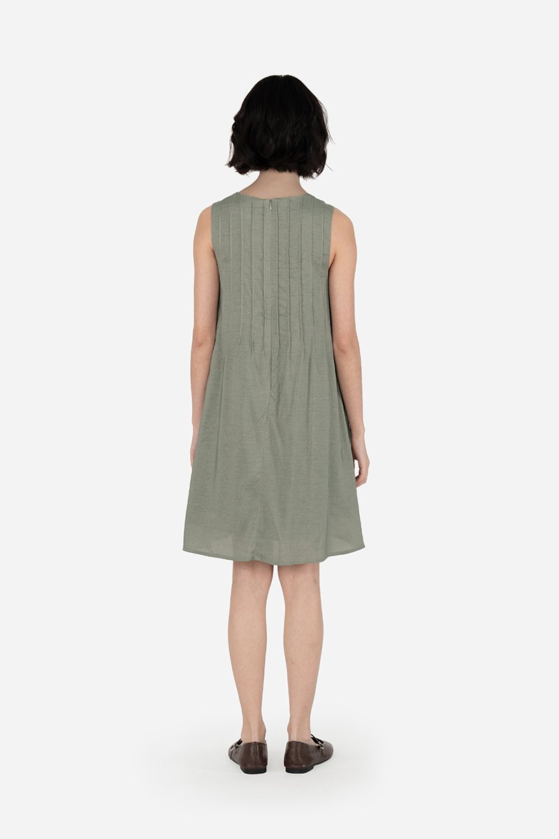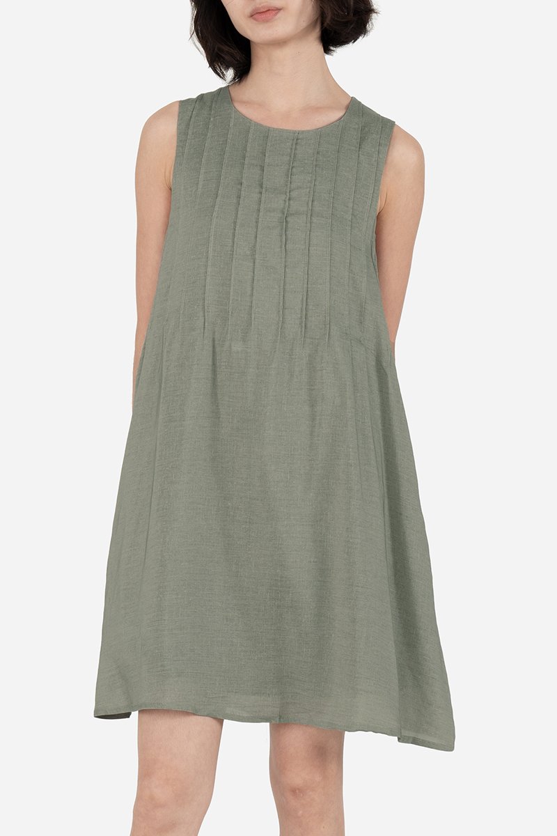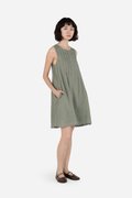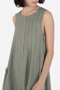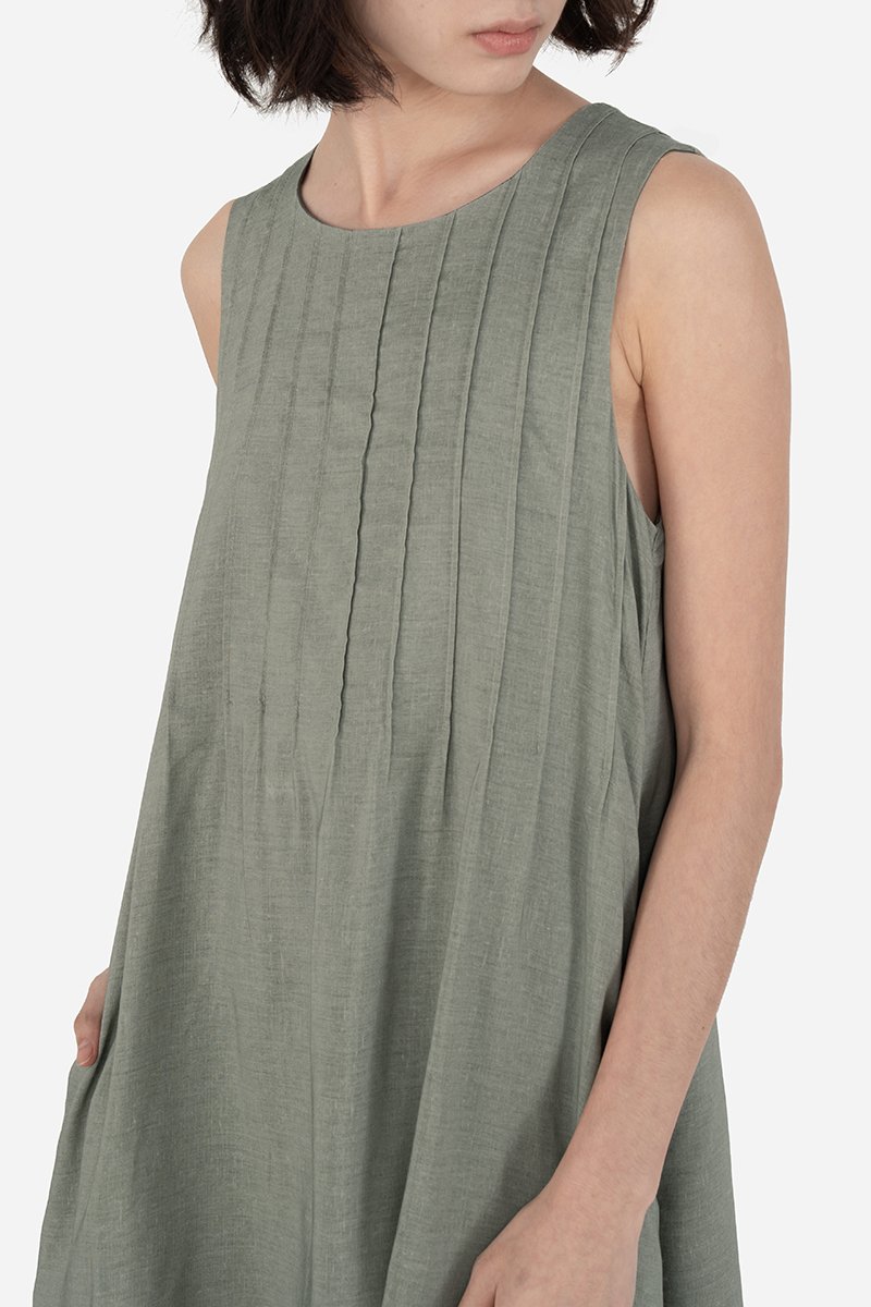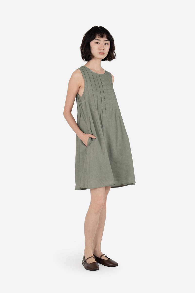 Ozuri, a not-so-classic mini dress. With a round neckline and vertical pintucked detailing across the front and back of the piece, this dress takes a casual turn in its loose A-line, sleeveless silhouette when paired with sneakers. Constructed out of the same lightweight cotton-linen fabric used for Jabari and Waylin, this dress is put together with a pure cotton lining and finished with inseam side pockets and a concealed back zip.