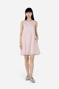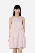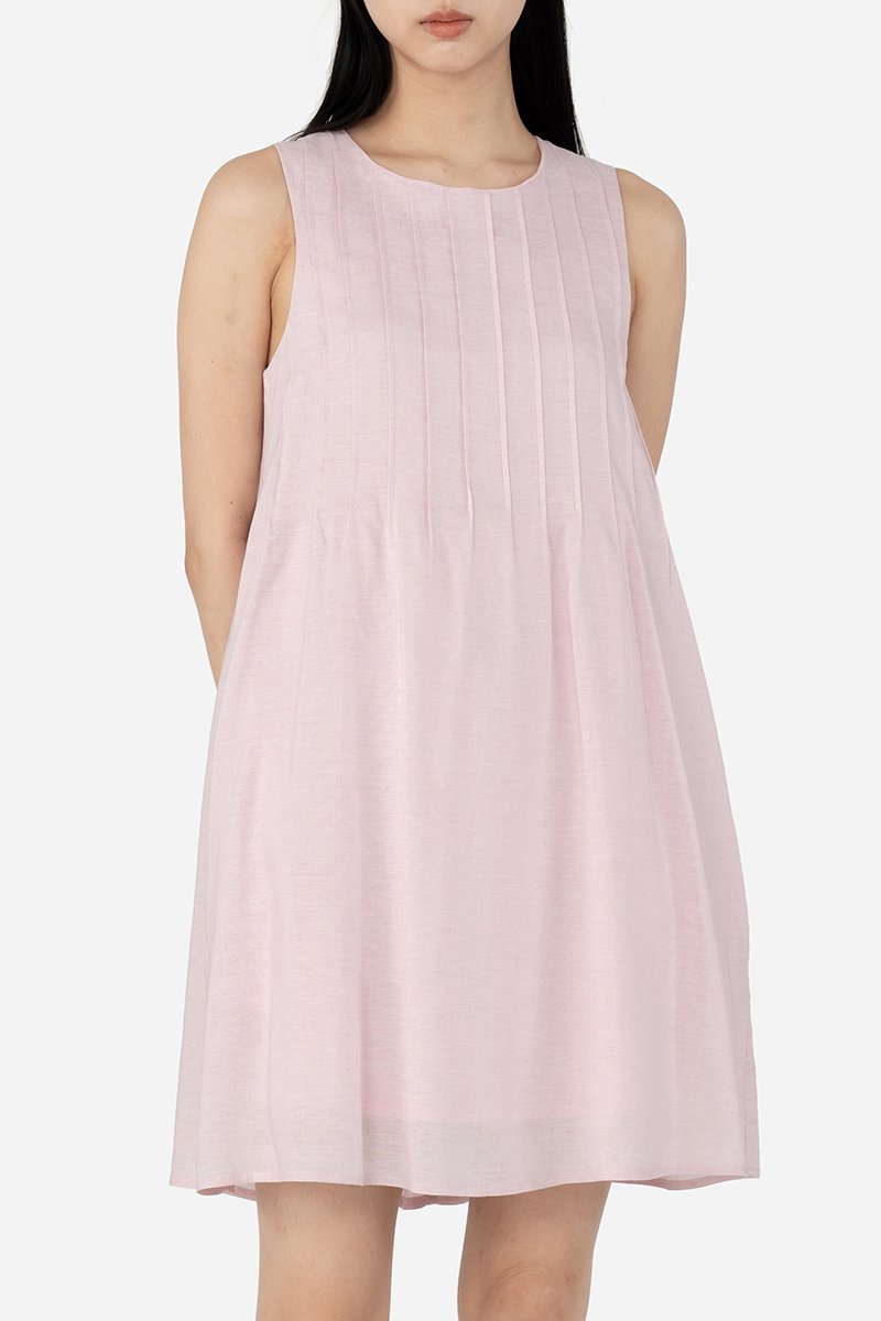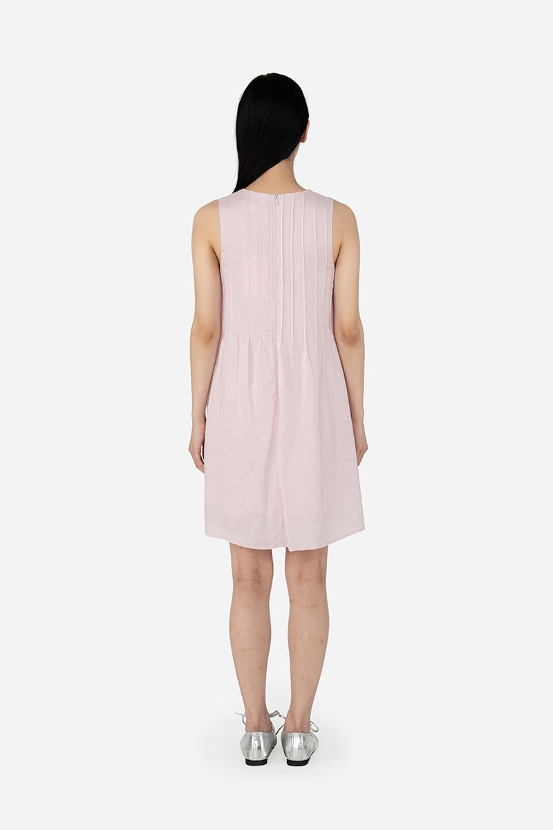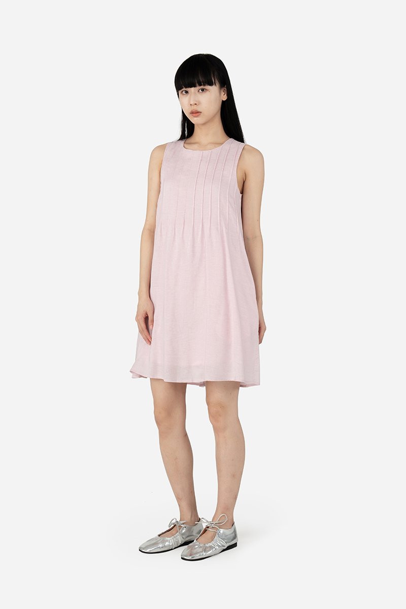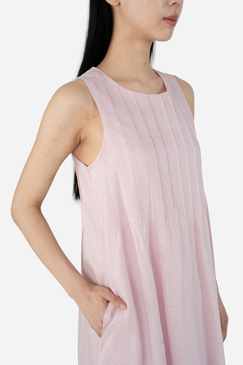 Ozuri, a not-so-classic mini dress. With a round neckline and vertical pintucked detailing across the front and back of the piece, this dress takes a casual turn in its loose A-line, sleeveless silhouette when paired with sneakers. Constructed out of the same lightweight cotton-linen fabric used for Jabari and Waylin, this dress is put together with a pure cotton lining and finished with inseam side pockets and a concealed back zip.