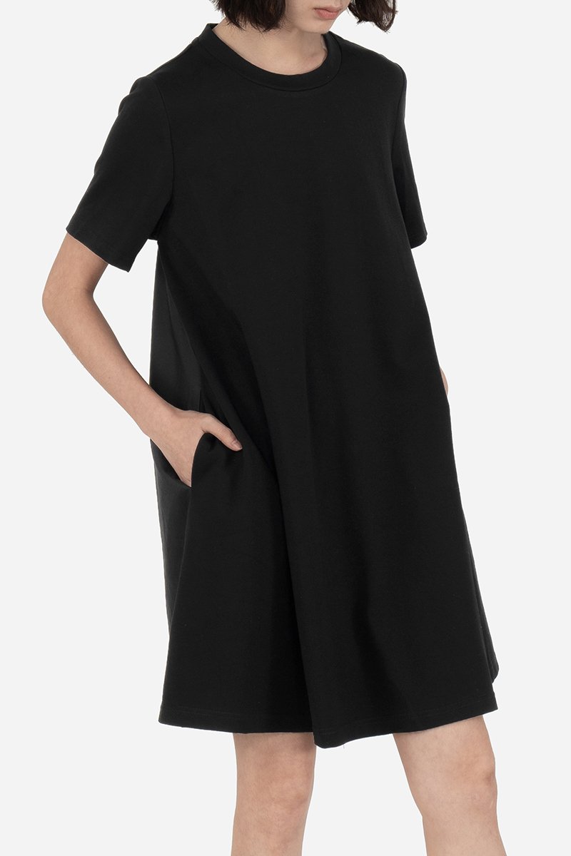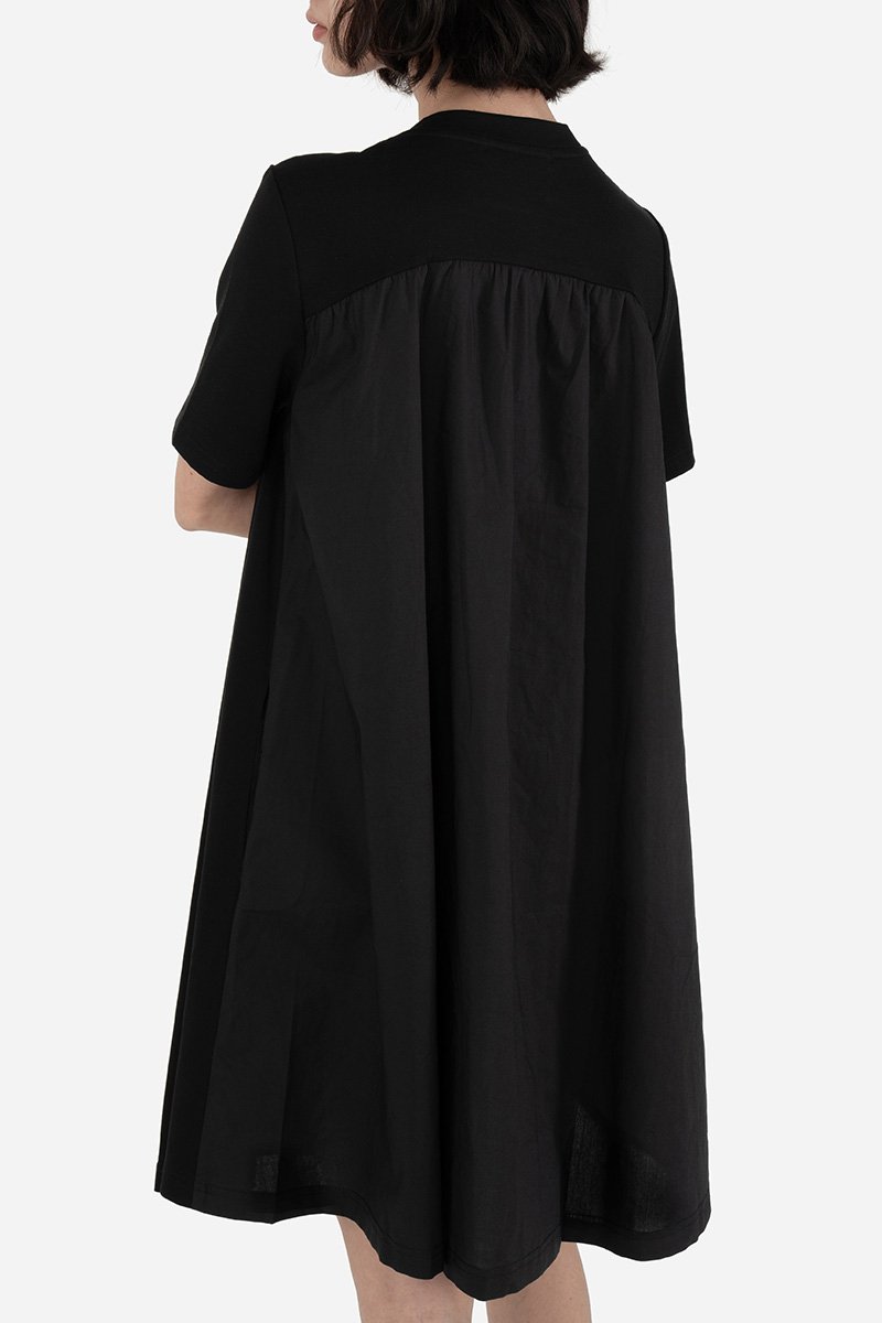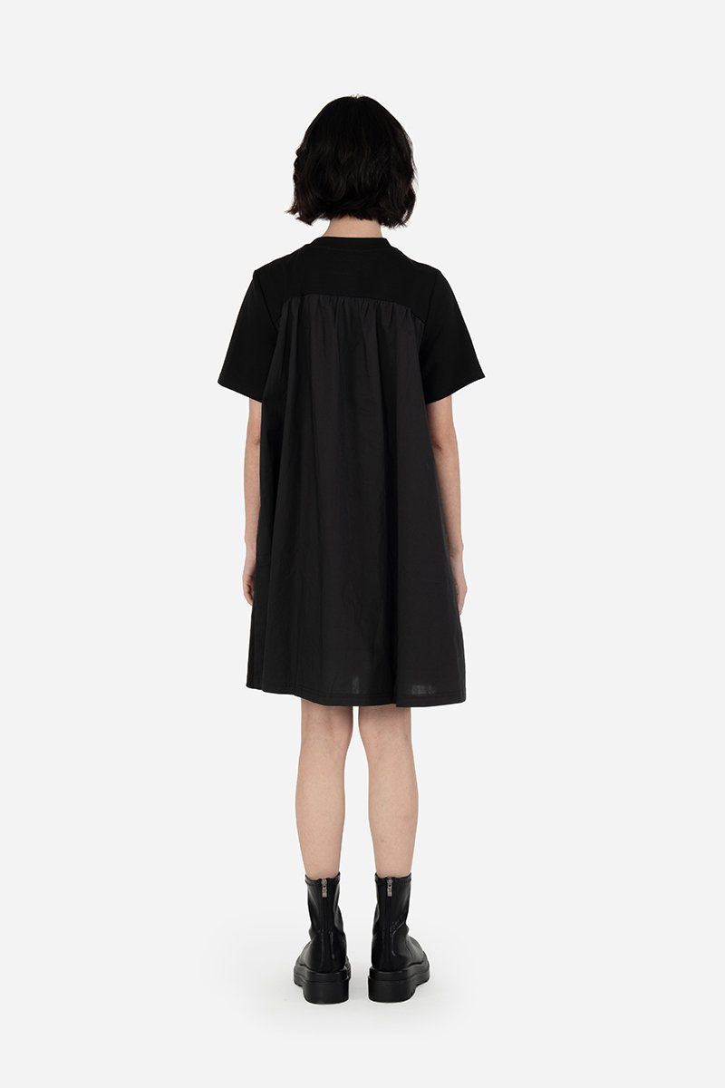 Zamira, not your everyday, jersey T-shirt dress. With short sleeves and a crew neckline, this partially lined, flare mini dress looks basic from the front and hides a twist at the back. It showcases a contrast woven gathered back panel for an added flare and comes with inseam side pockets to hold your belongings. Both fabrics constructed out of 100% cotton, Zamira holds the right amount of uniqueness for those looking for something different.