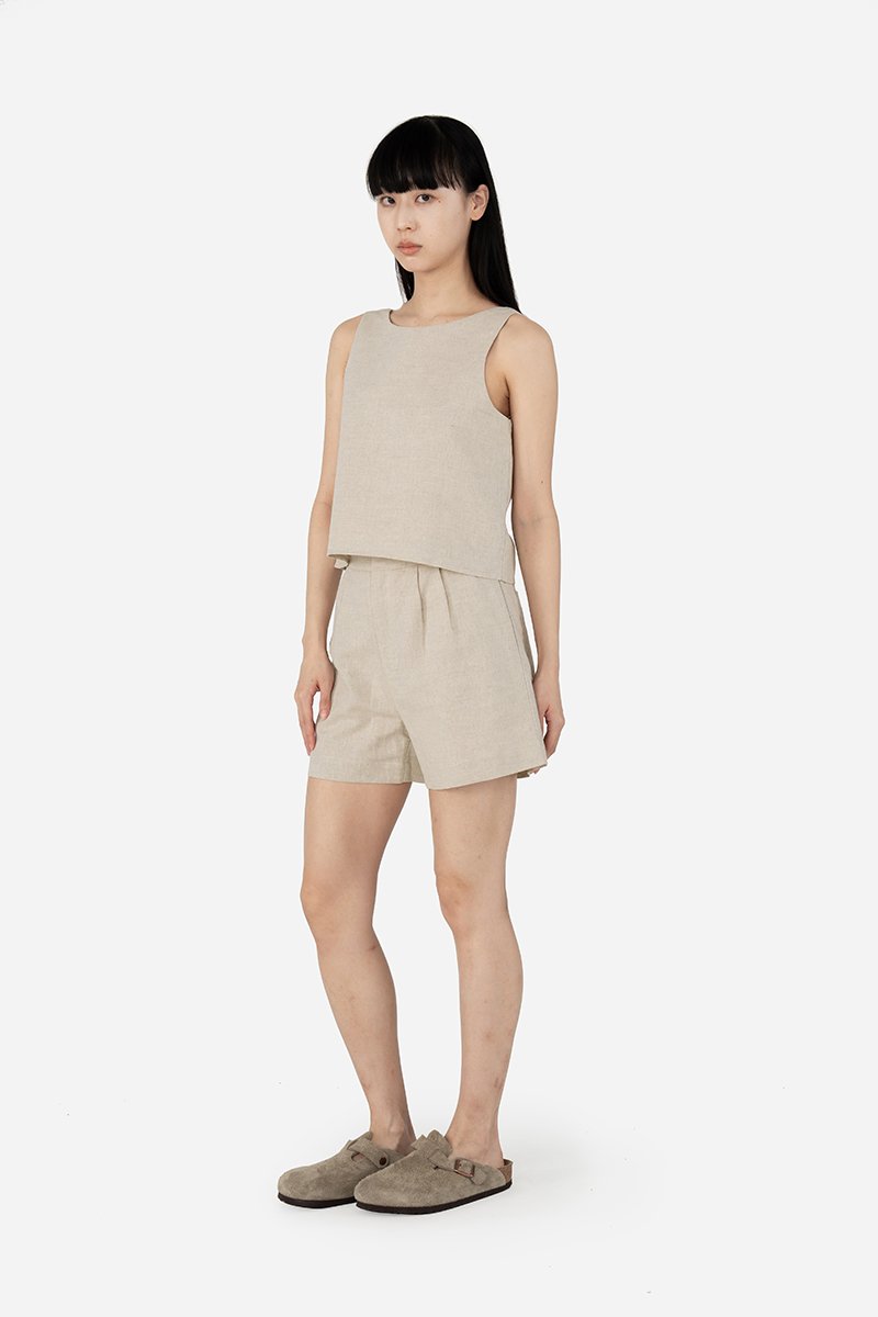 Style your favorite tops such as Zayrie, Carmen, Quileen, or Yesseca with the Fable Shorts, crafted from cotton-linen fabric with a full cotton lining for breathable comfort. A thick waistband, front zip with clasp closure, and double pleat detailing provide a structured, flattering fit, while side inseam and back patch pockets keep essentials close at hand. Designed as the co-ord to the Jovi and Xena Tops, Fable allows for versatile pairing with other same-fabric pieces for endless outfit options.