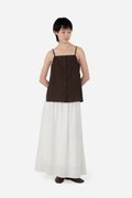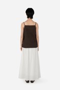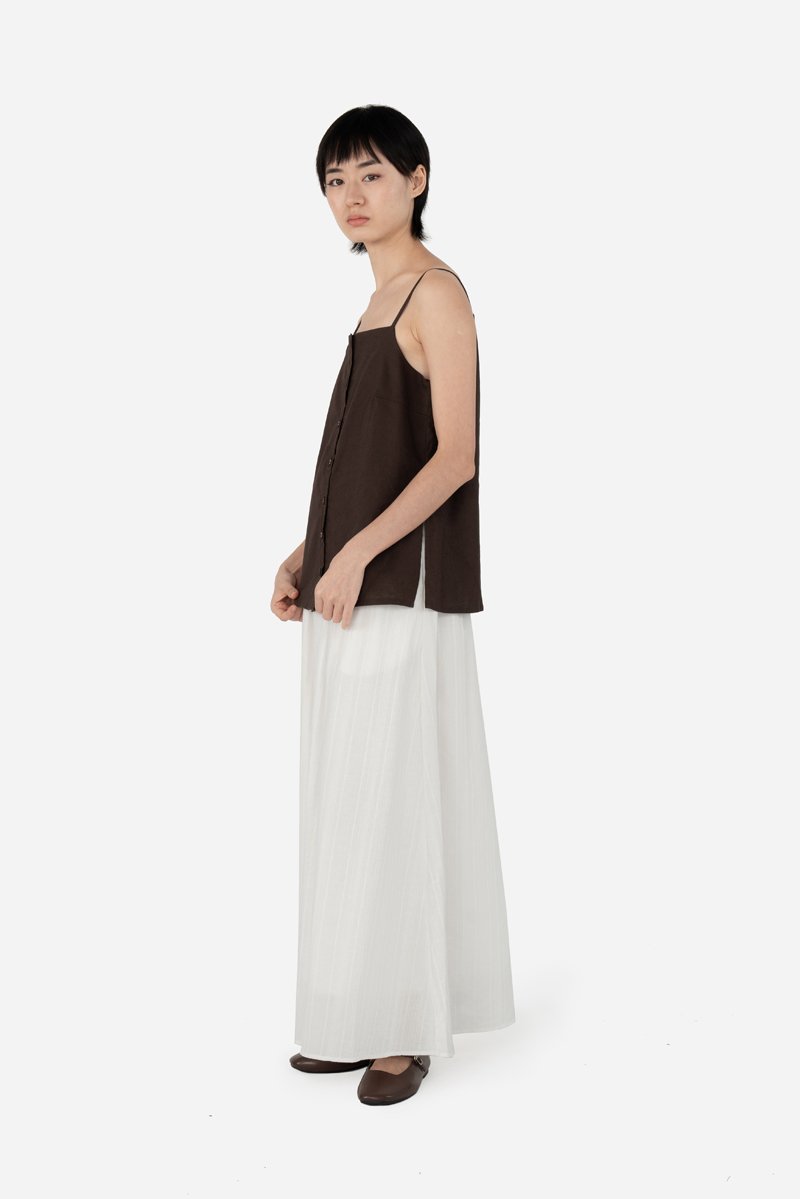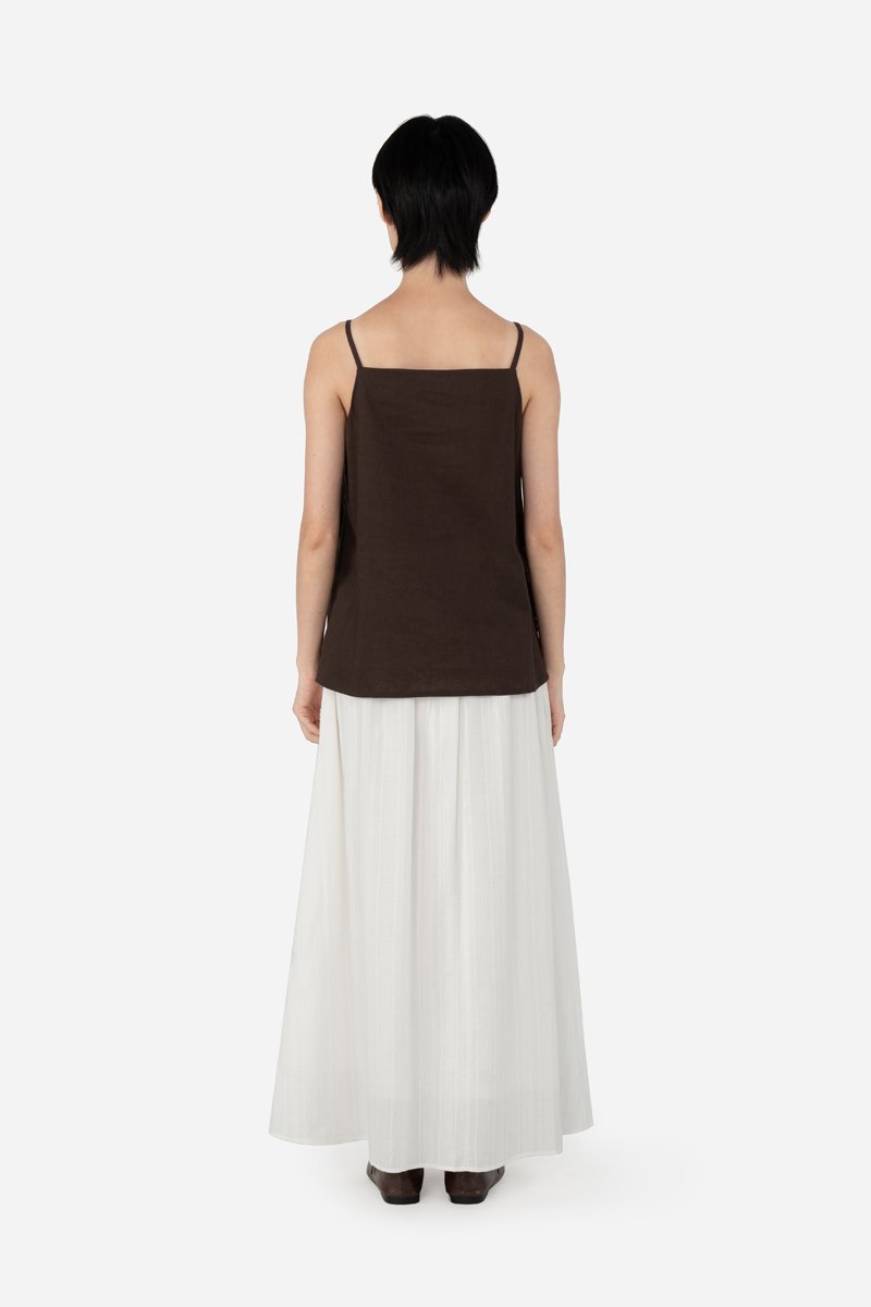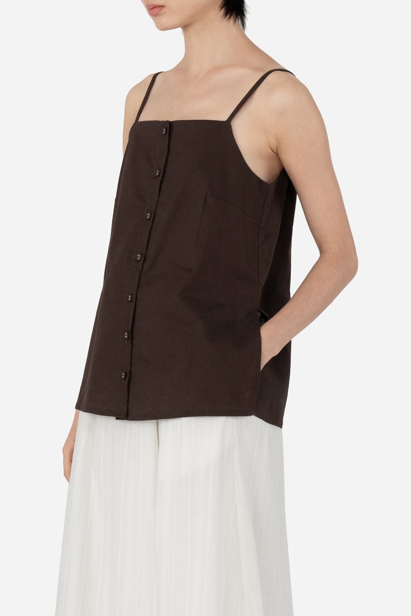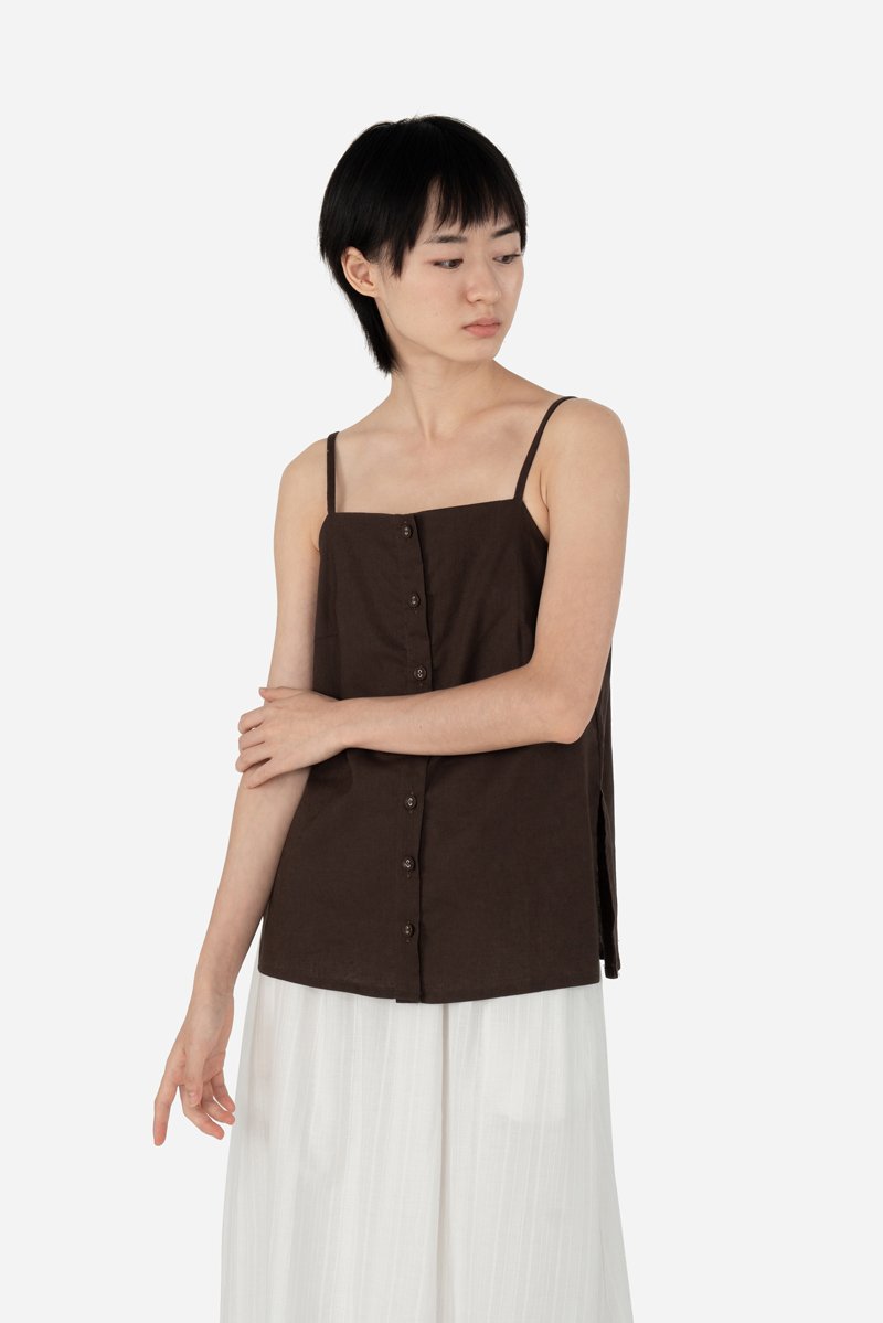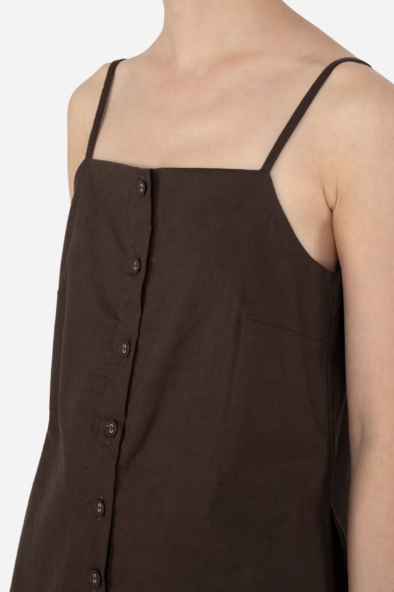 Arleen, a new addition to our cami collection. It features a straight neckline, non-adjustable straps and a functional button down. With side slits, Arleen is a long line cami minimalistic in nature, that styles fuss-free with your favourite bottoms. Sharing the same cotton-linen fabric as the Zareen Top, this cami is partially lined with a pure cotton lining for comfort.