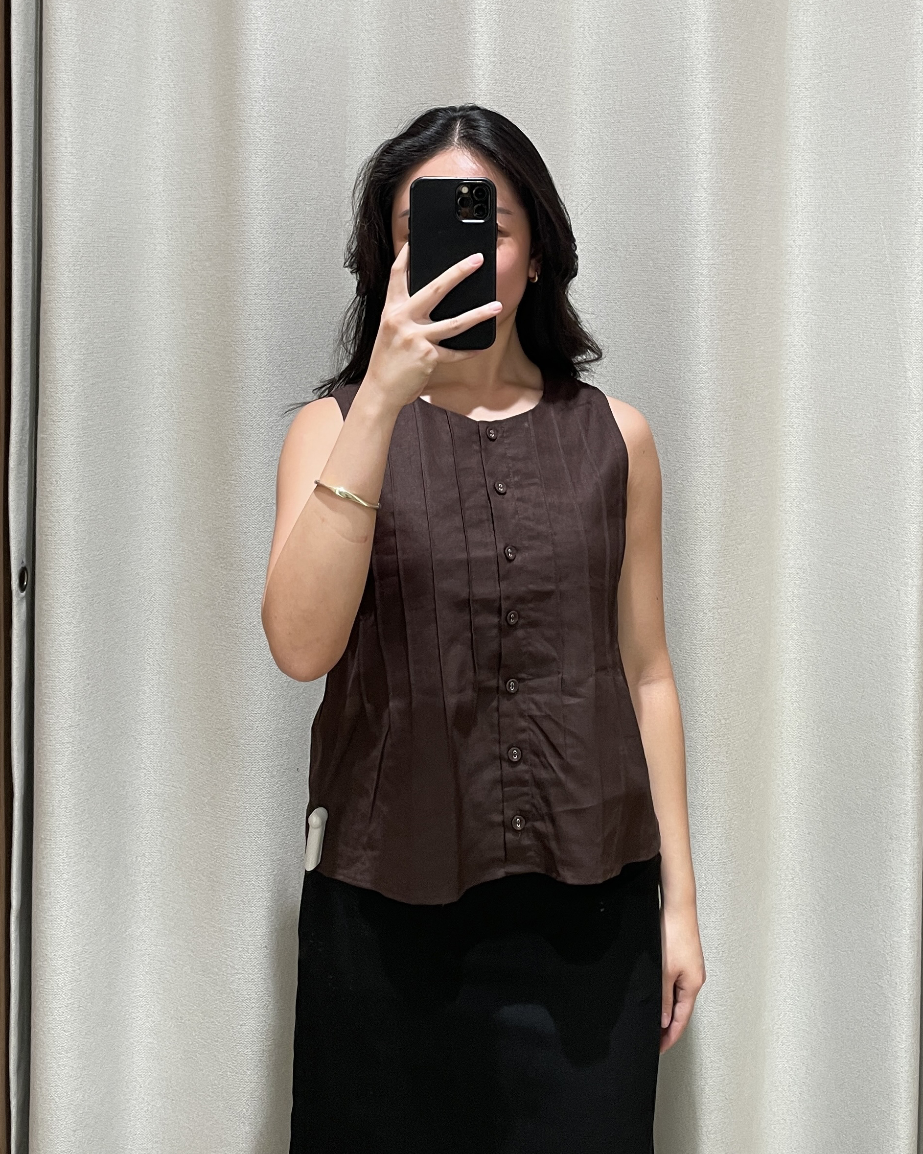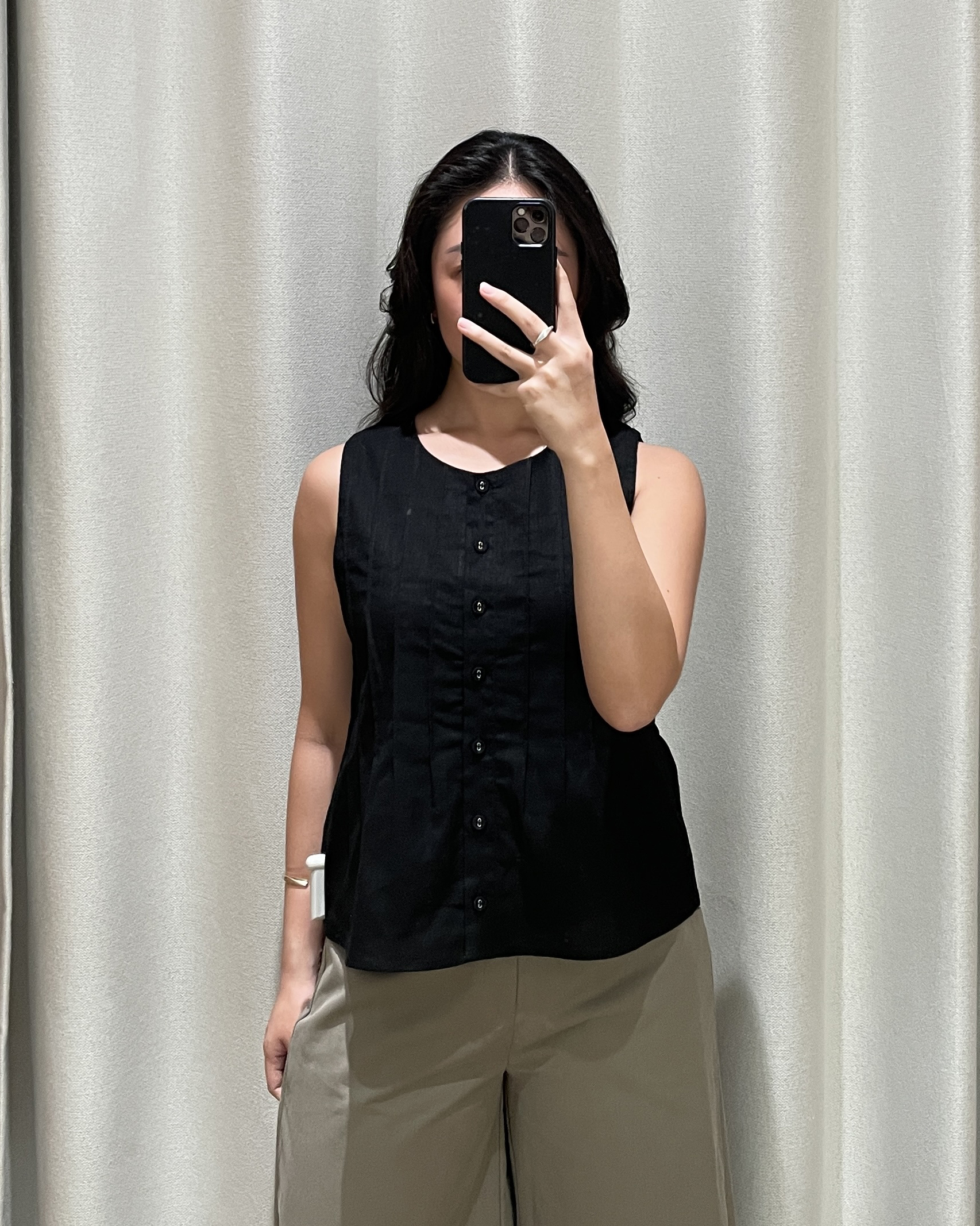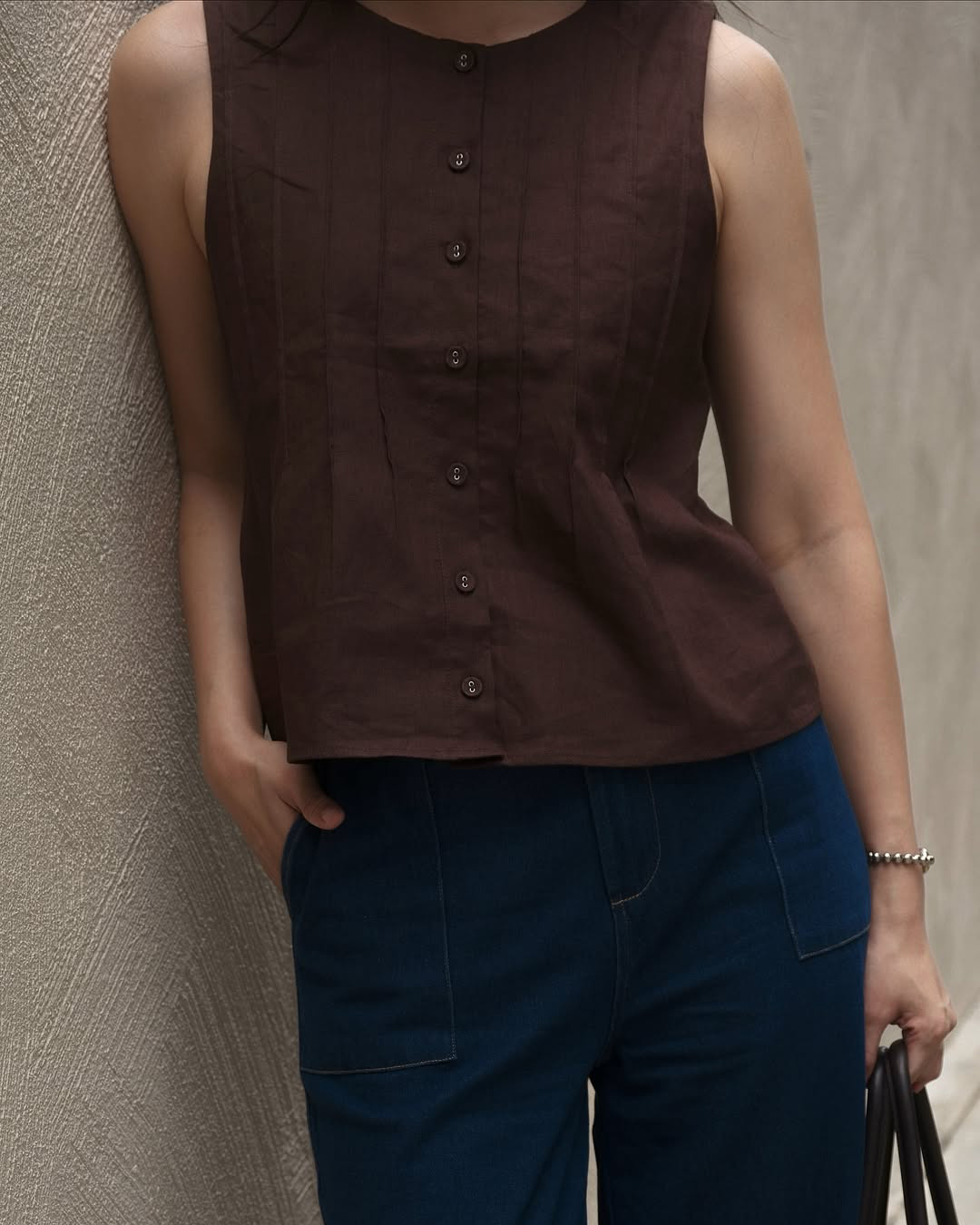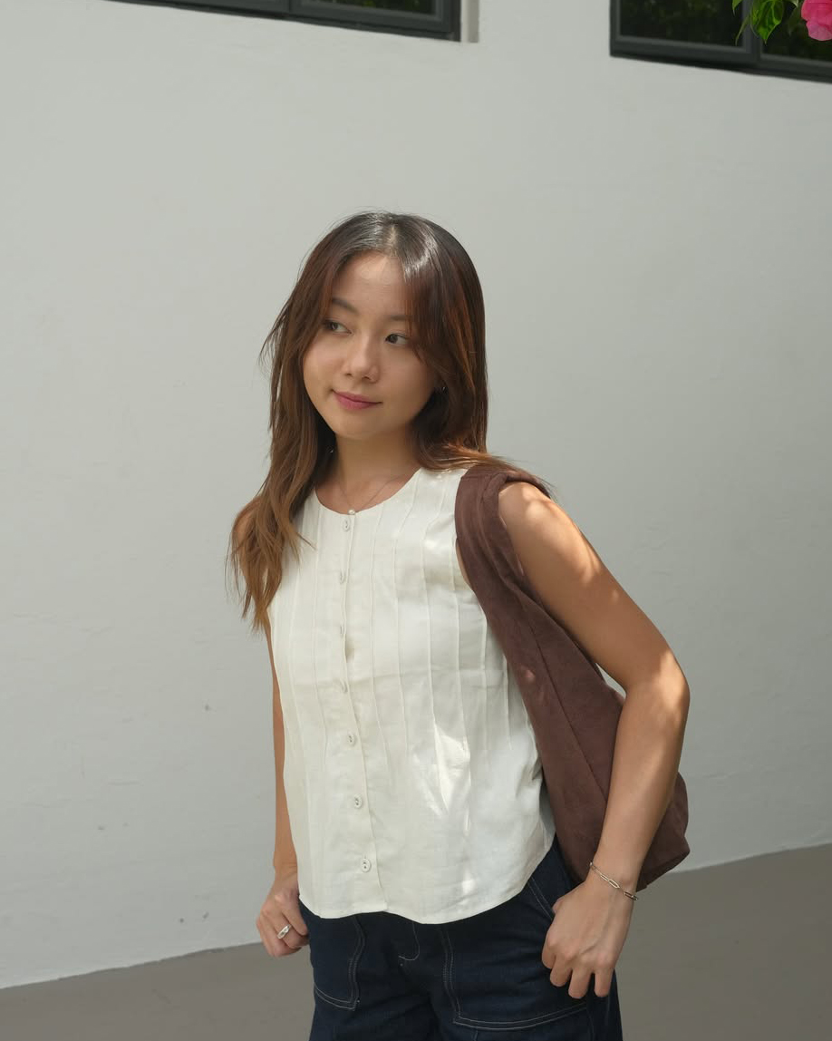 Freshen up your capsule wardrobe with the Zareen Top. Featuring a round neckline, this sleeveless piece comes with a functional button down with matching fabric buttons. The vertical pintuck detailing front and back leads into a slight flared silhouette, which effortlessly delivers a sculpted feel. Tapping into the same cotton-linen fabric and pure cotton lining used to construct the Delancy Dress, Zareen brings elevation to any simple fits, making it perfect for the classics, minimalists.