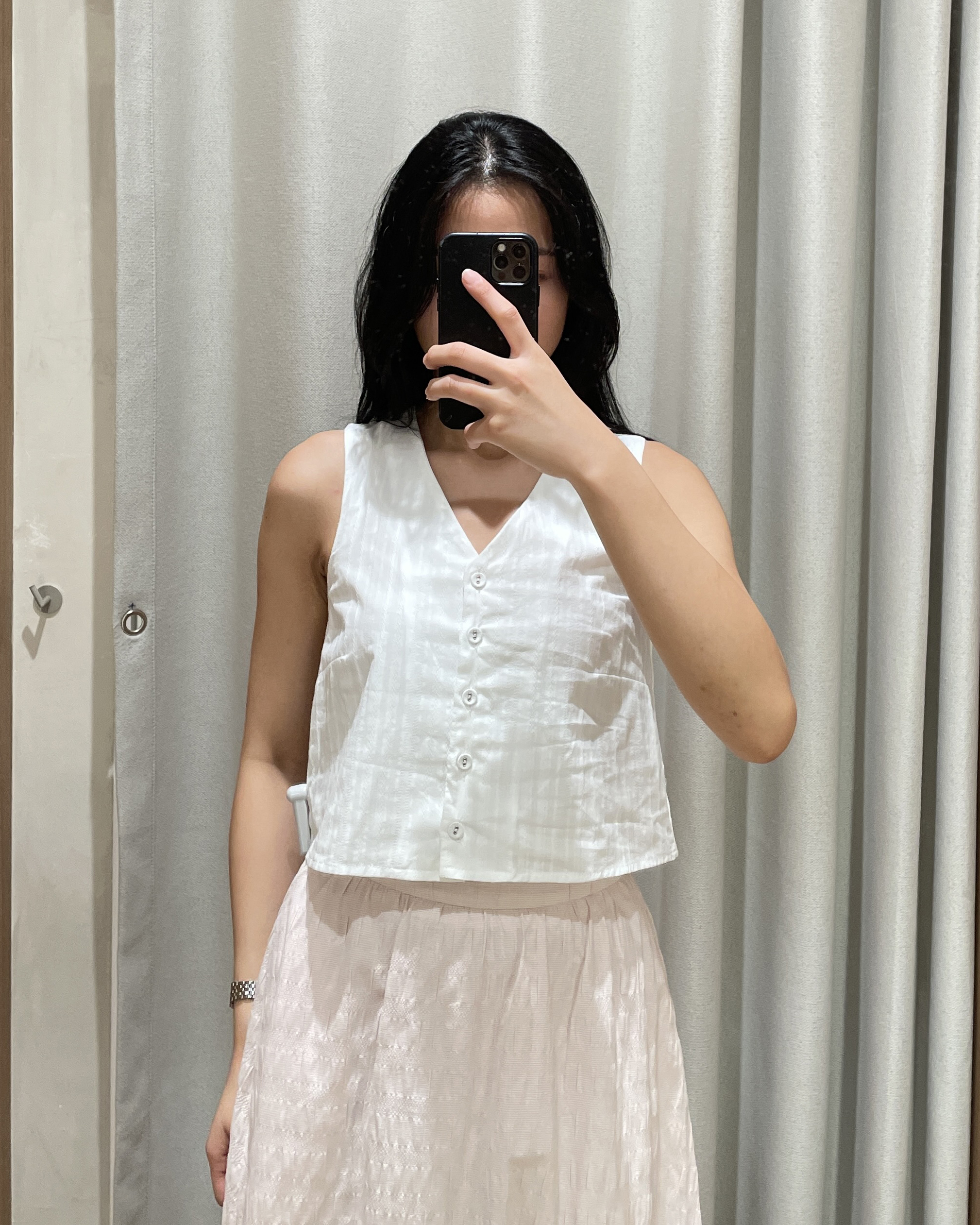 Carmen, a simple button-down top that comes fully lined at a cropped length. Crafted from the popular cotton-linen fabric used for Dirus and Zuka, it has a pure cotton lining, standard V-neckline, bust darts and fabric buttons for a polished look. Can be layered on as a sleeveless, cropped outerwear or worn as it is, providing versatility that adds depth and flexibility to your fits.