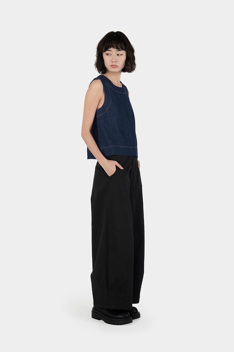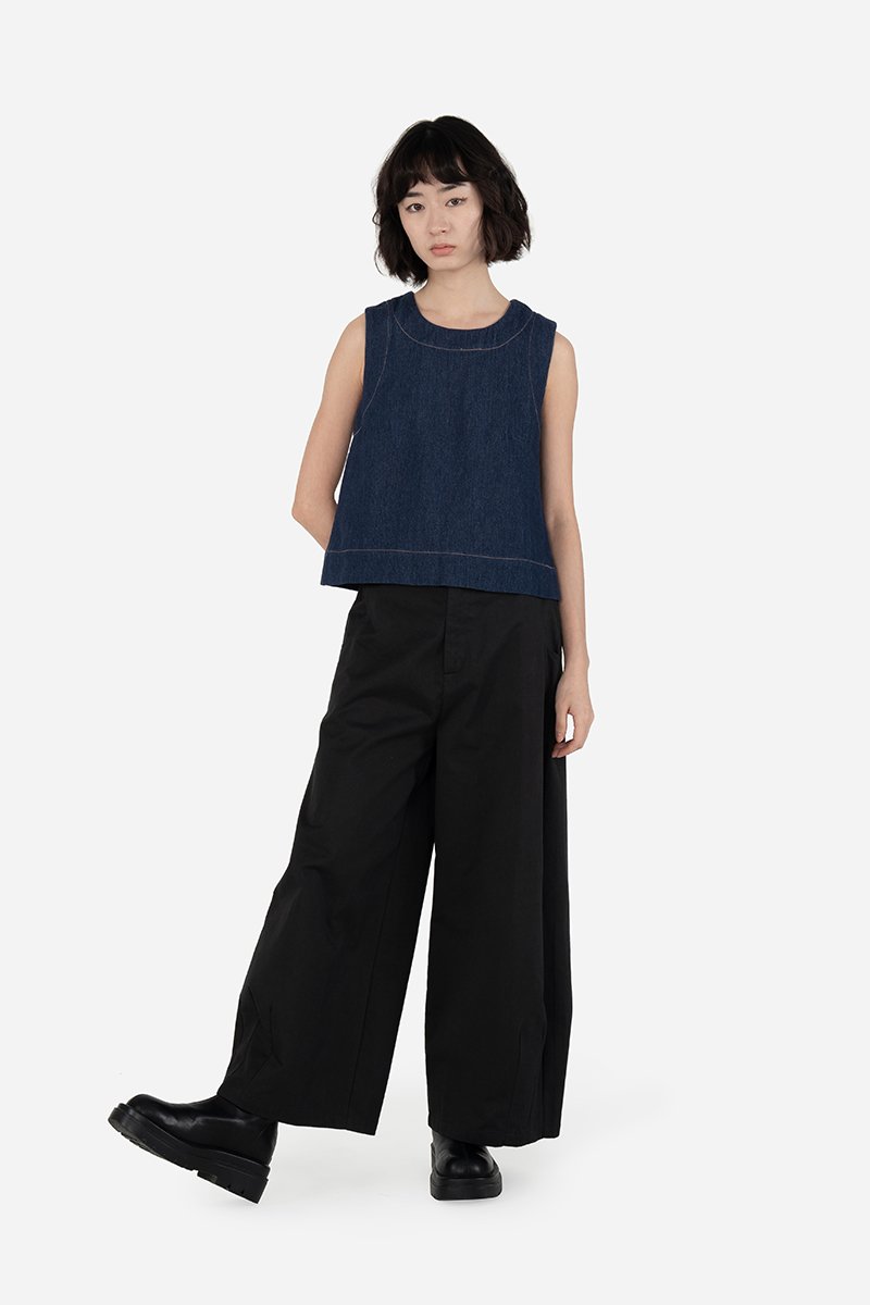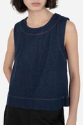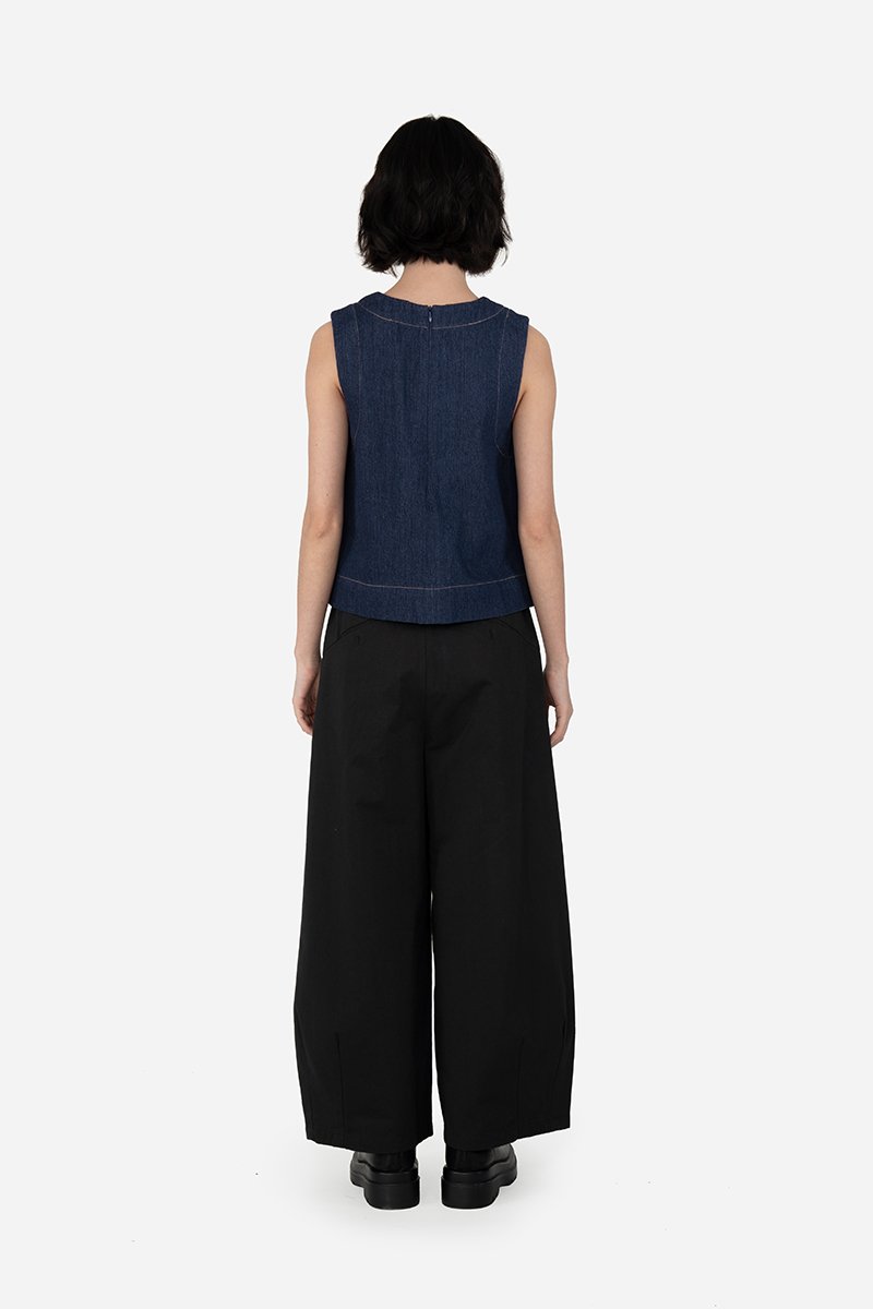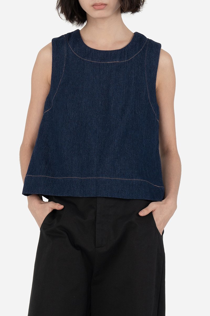 Fenna, our Erzin-inspired top in lightweight denim. Constructed out of cotton blend fabric, this sleeveless piece comes unlined and is similarly fitted with a back concealed zip. Retaining its key feature — the thick-stitched high round neckline, Fenna embodies timelessness with a touch of playfulness.
