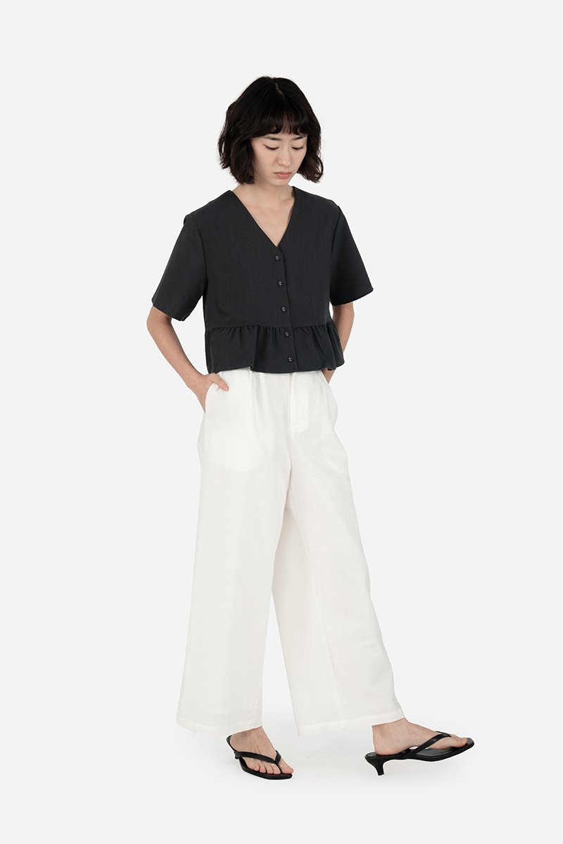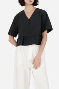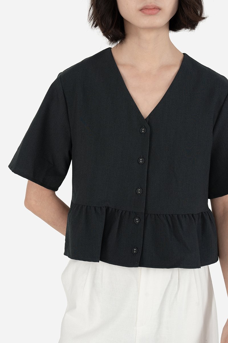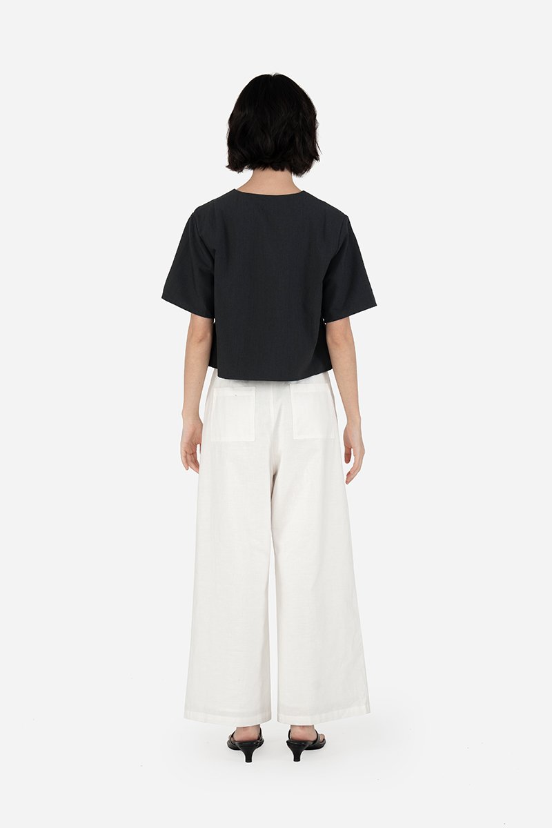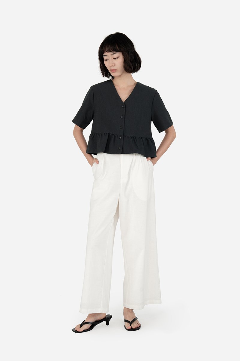 A balanced, feminine blouse for both casual and workwear. Fully lined, Herta is a short-sleeved piece that features a V-neck button down and gathered waist seam. It's constructed from the same rayon blend fabric as Gernai Top and can be worn as a co-ord set with the Elodie Pants.