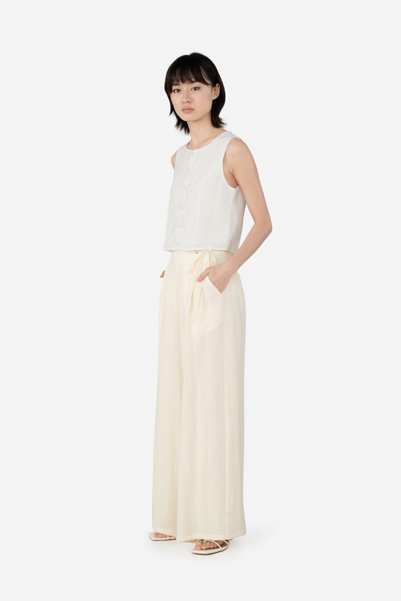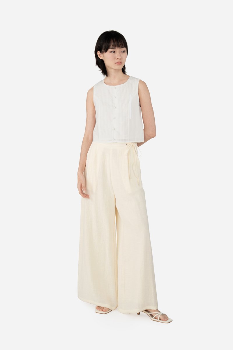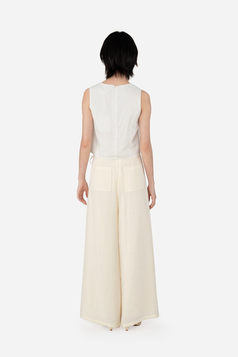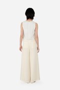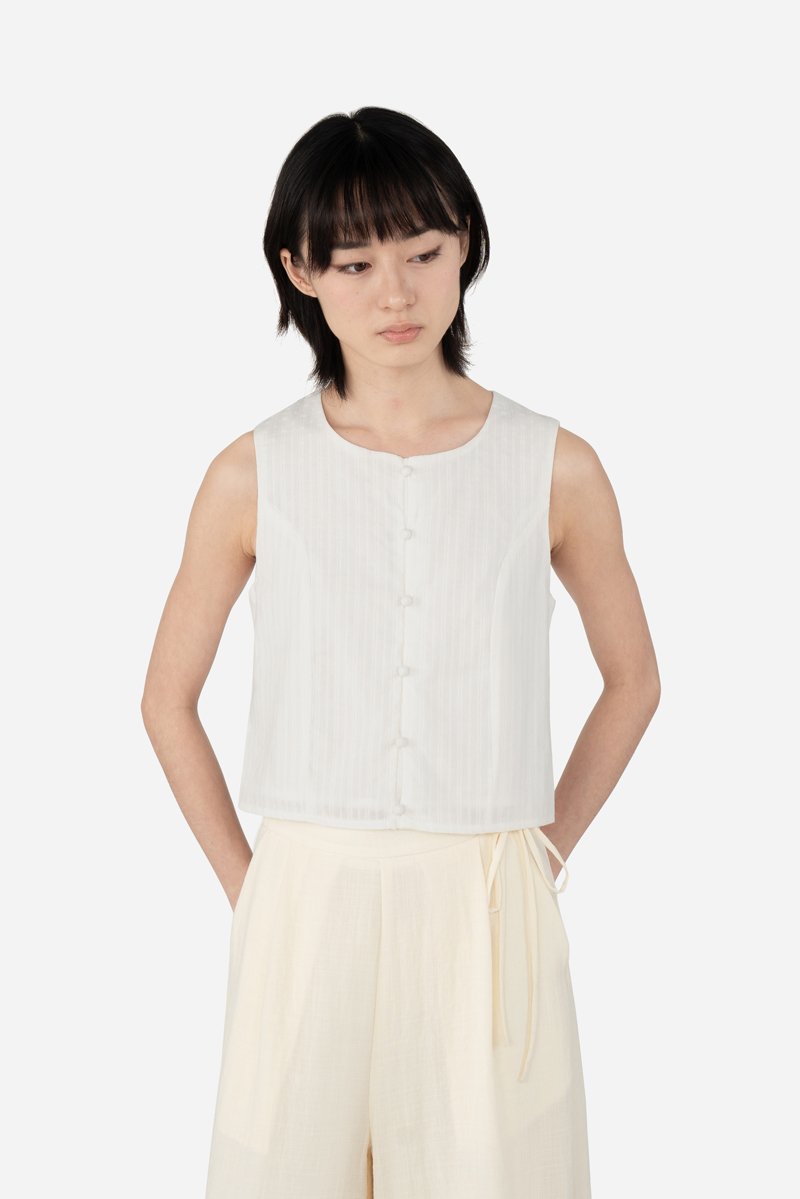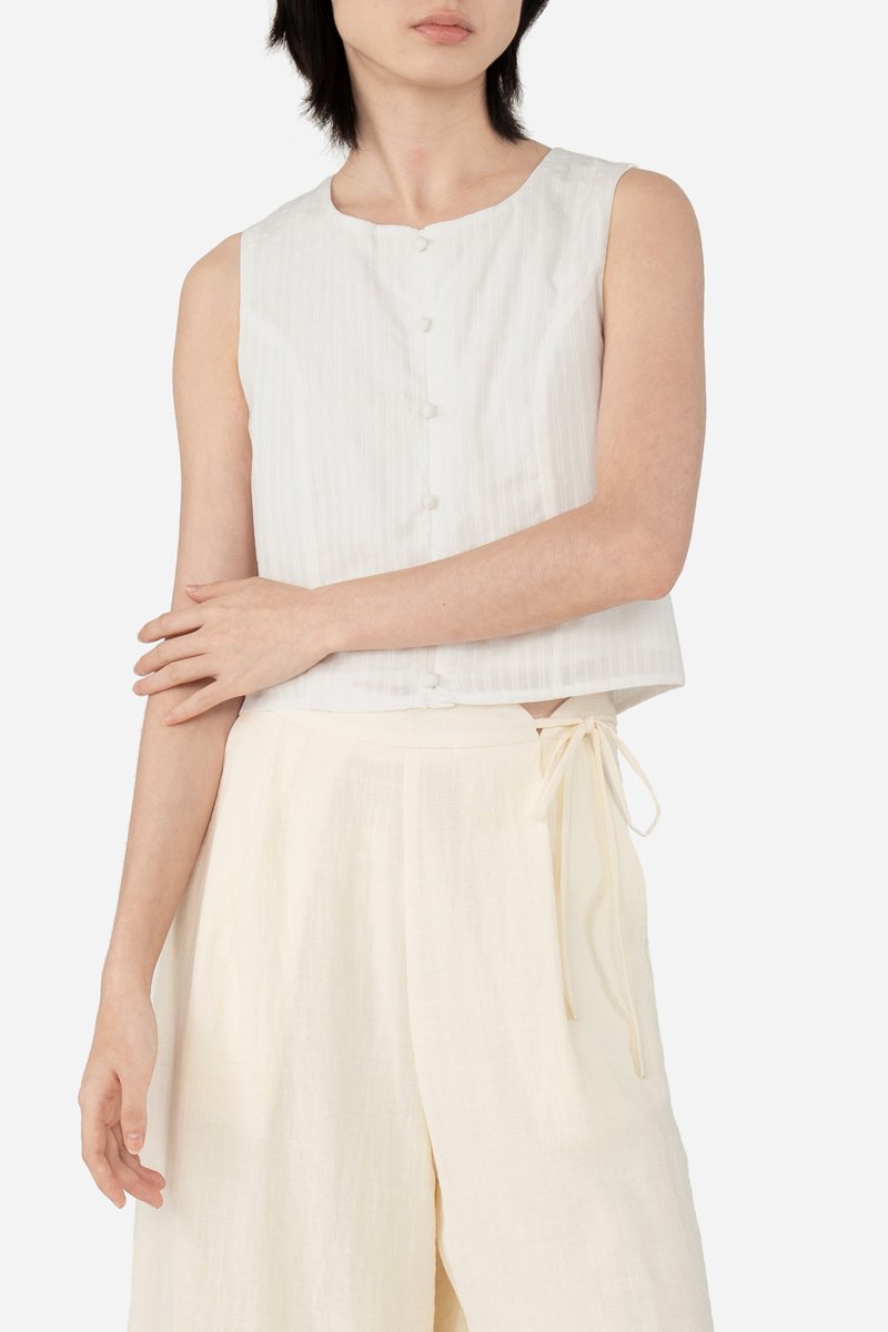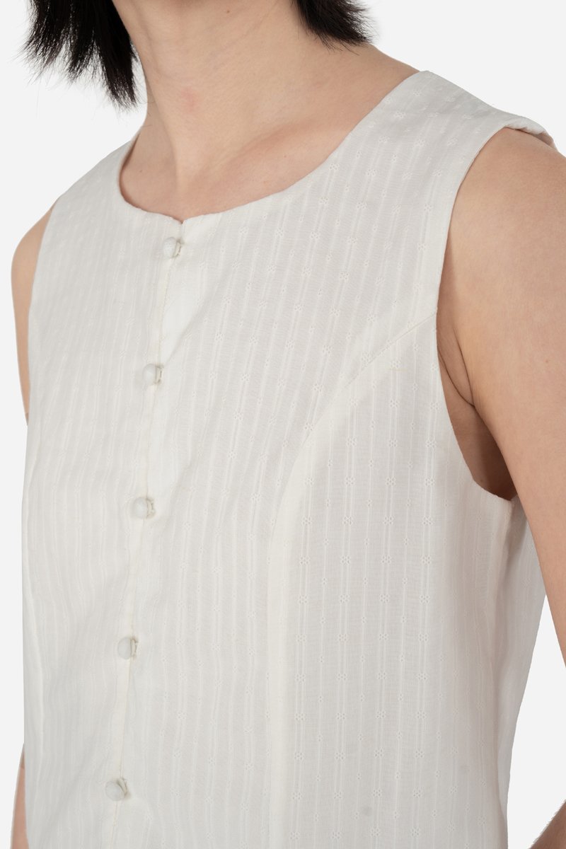 Jessi, delivering a chic, stylish outfit in ease. Zeroing in onto the details, unlike your regular tops, this sleeveless piece has added princess panelling as well as a functional button down with mushroom buttons. A concealed zip is also fitted at the back for easier wear. Presented with a standard round neckline, Jessi is assembled with a cotton blend embroidered outer fabric and a full, pure cotton lining.