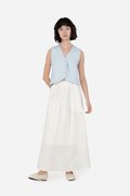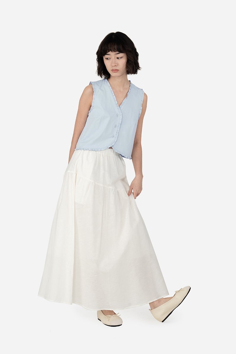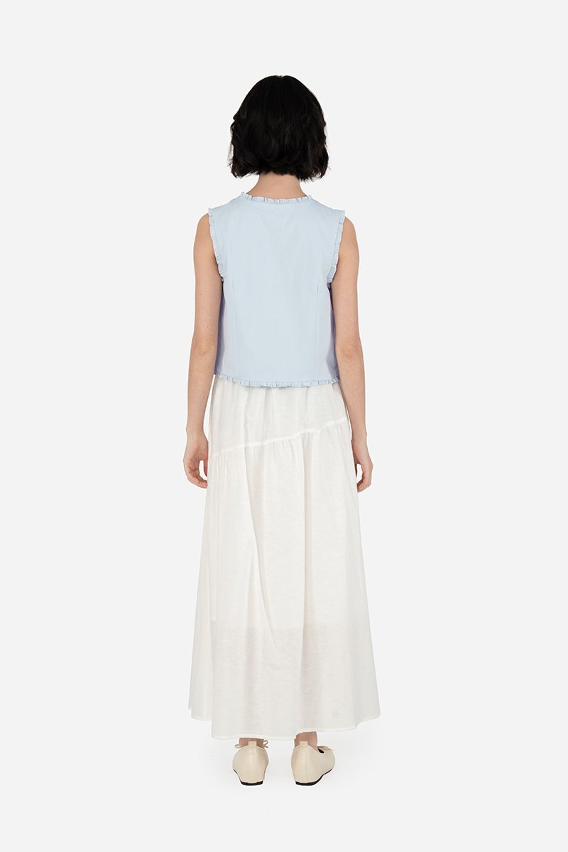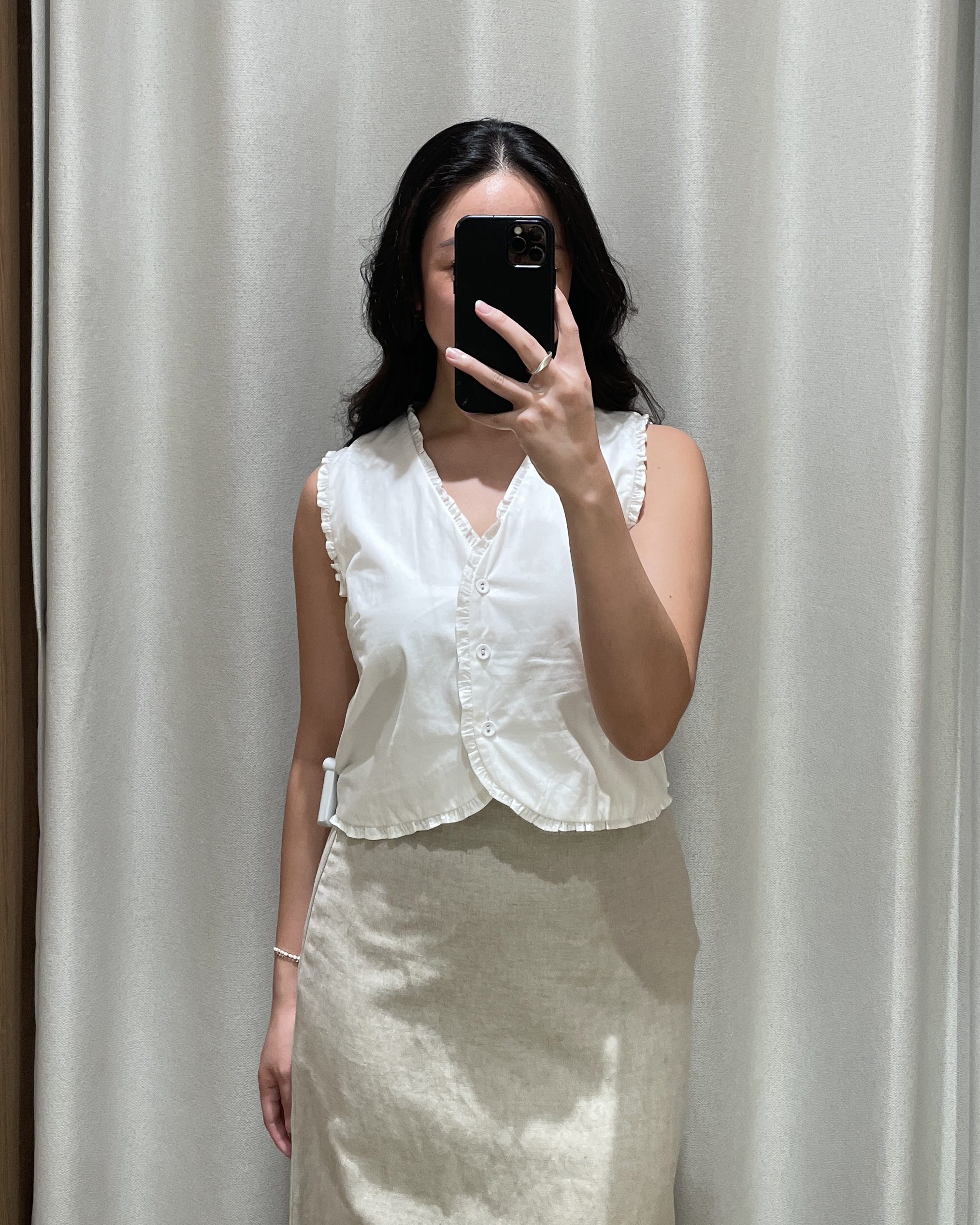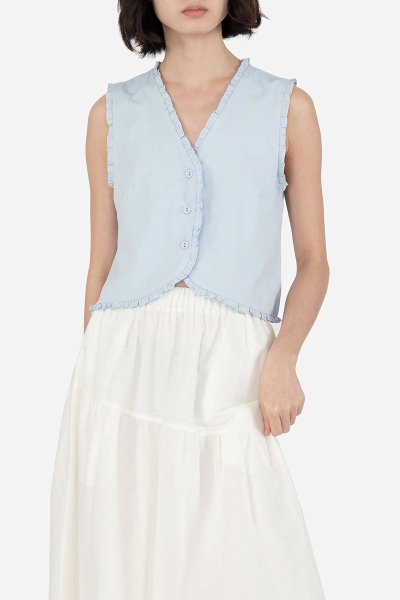 Not shying away from the ruffle, Kylee is ruffle-lined on all hems for a true feminine flair. Featuring the same 100% cotton as the Norani Dress, this top is fully cotton lined and comes in a cropped length. It has a V-neckline and a button down with matching fabric buttons that allows you to style it up as a vest. Playful and versatile on its own, Kylee will surely deliver a stylish look.