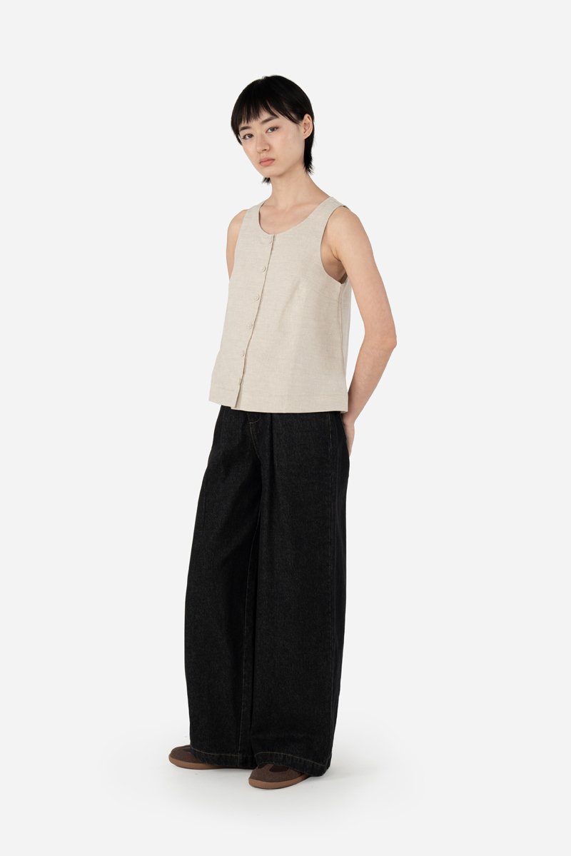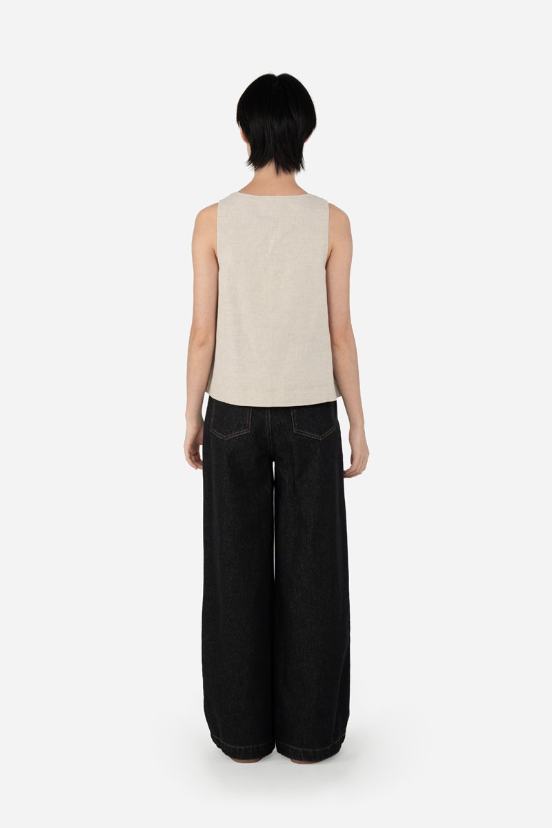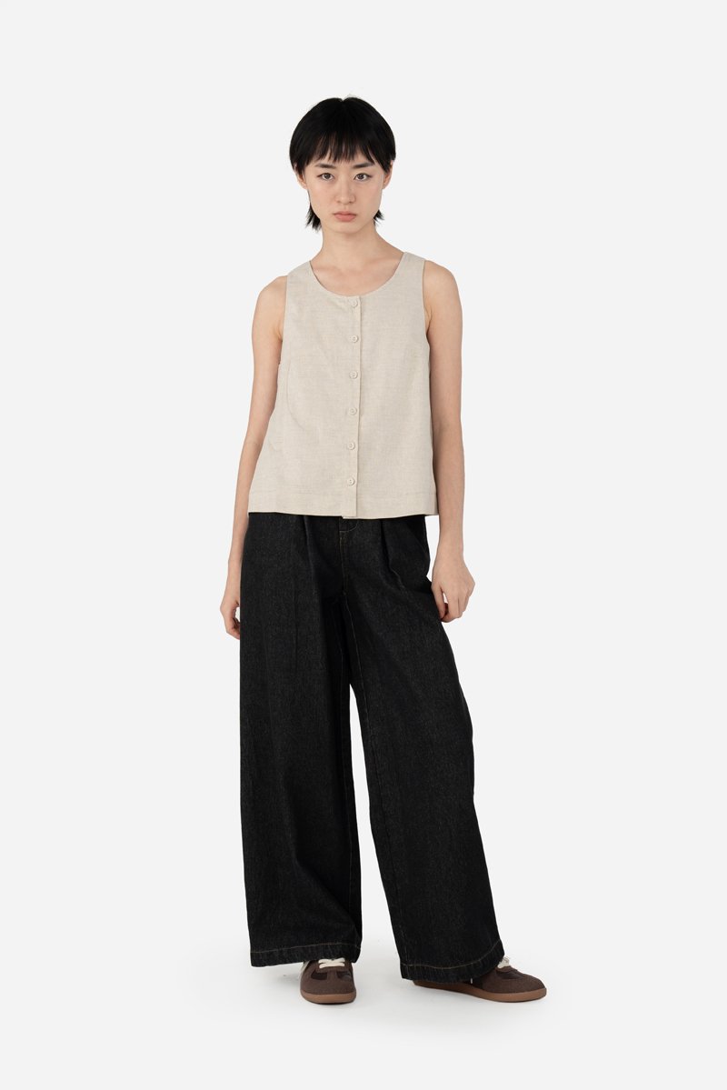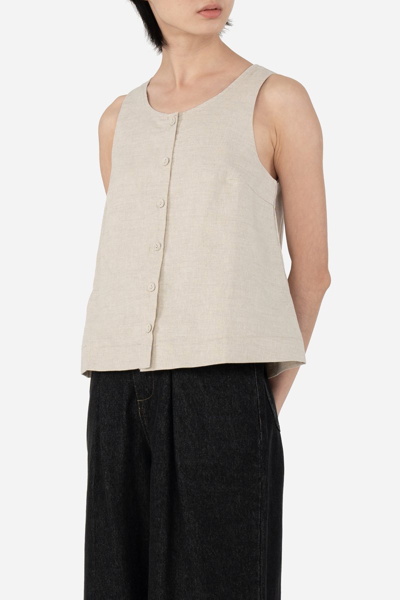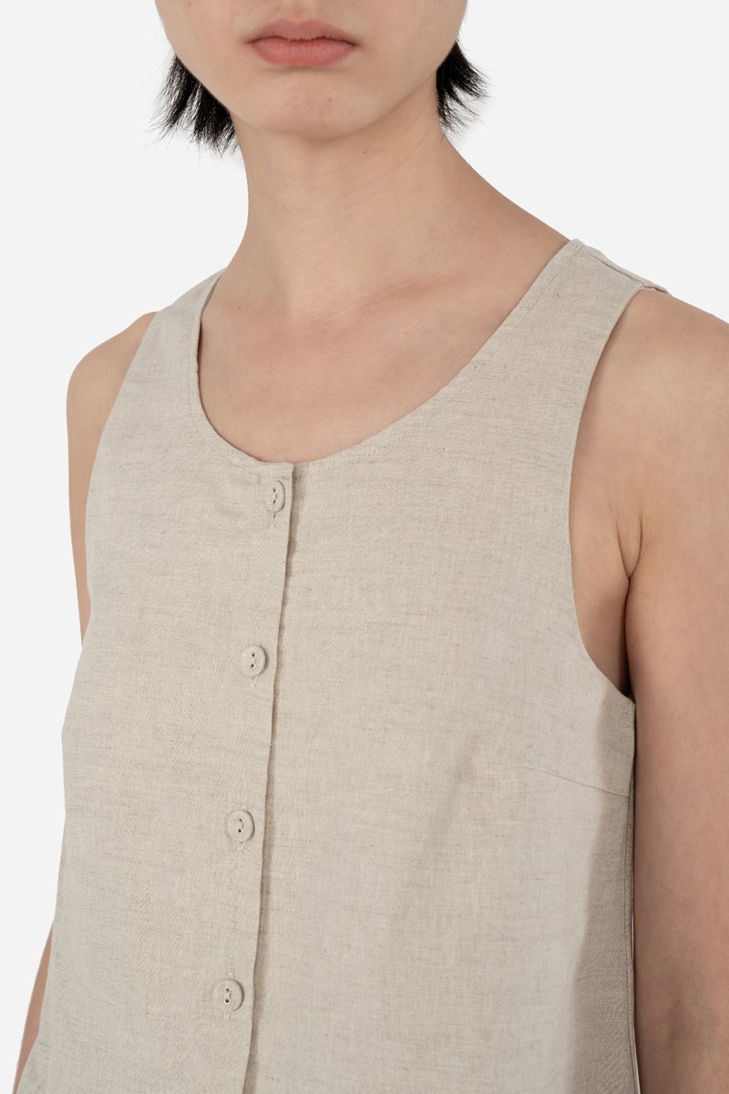 Quella brings timeless ease to your wardrobe with its sleeveless, round-neck design. Crafted from cotton-linen and fully lined in pure cotton—the same material as the crowd favourites Carmen, Zayrie, and Zuka—this tank feels light, breathable, and comfortable for all-day wear. It features a button-down front and a thick stitched hem for subtle structure and finish. Simple and versatile, Quella can be paired with Xylon or styled with your favorite bottoms for a clean, effortless look.
