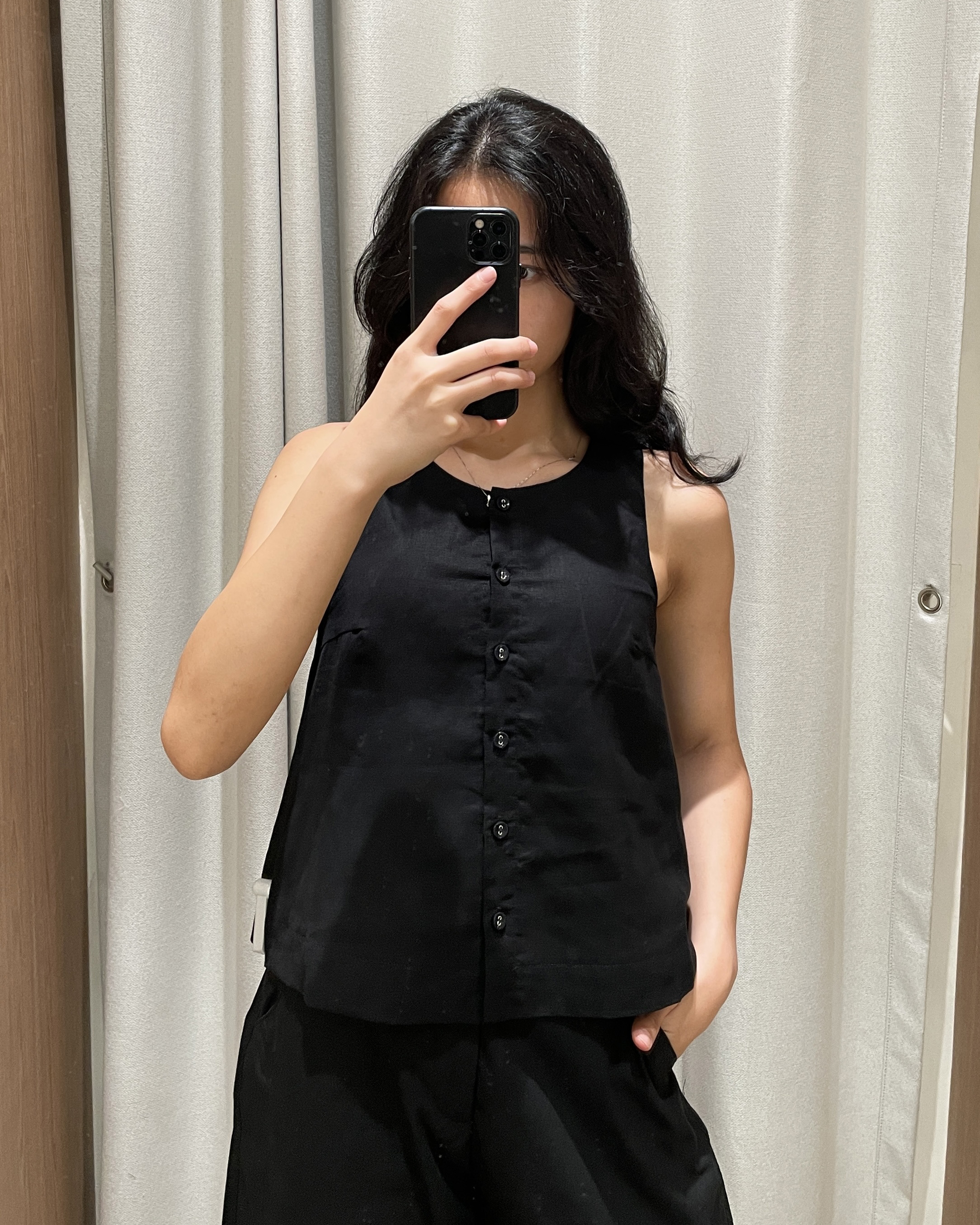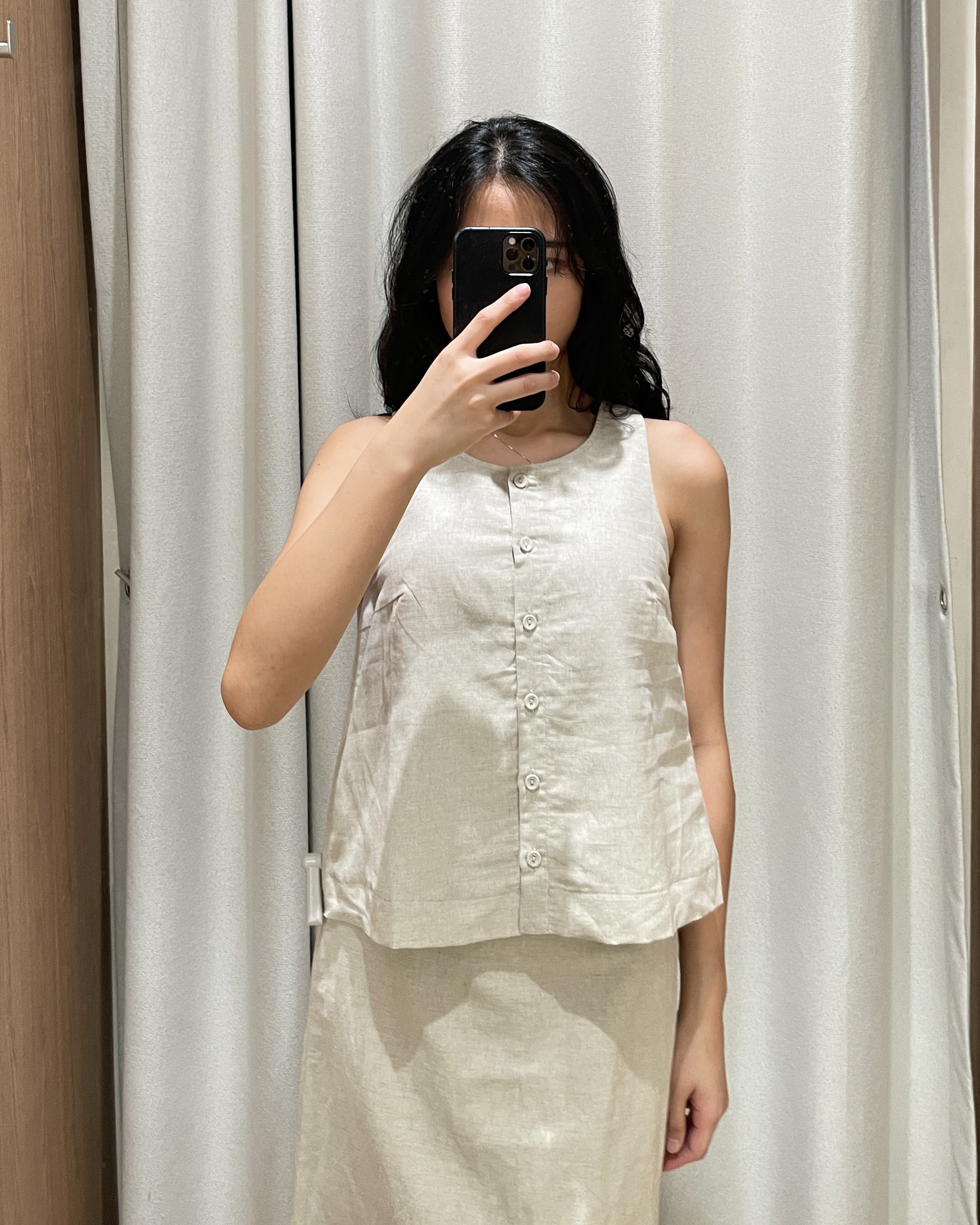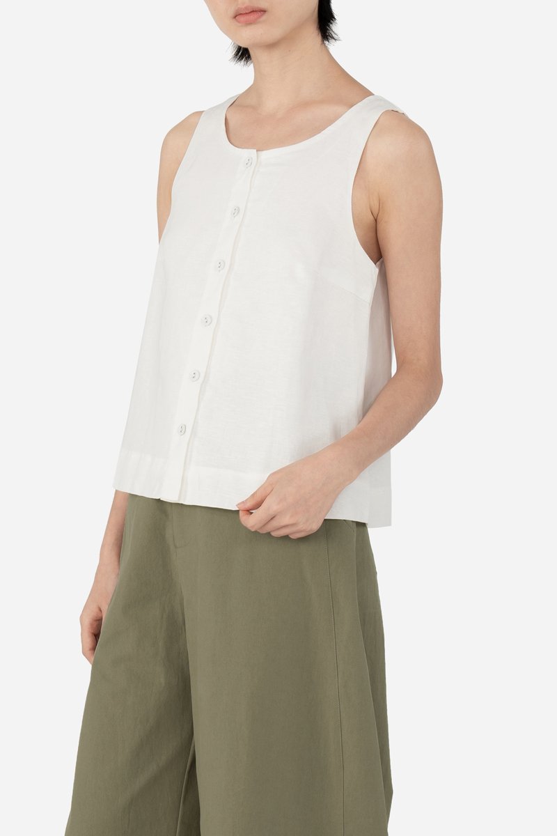 Quella brings timeless ease to your wardrobe with its sleeveless, round-neck design. Crafted from cotton-linen and fully lined in pure cotton—the same material as the crowd favourites Carmen, Zayrie, and Zuka—this tank feels light, breathable, and comfortable for all-day wear. It features a button-down front and a thick stitched hem for subtle structure and finish. Simple and versatile, Quella can be paired with Xylon or styled with your favorite bottoms for a clean, effortless look.