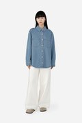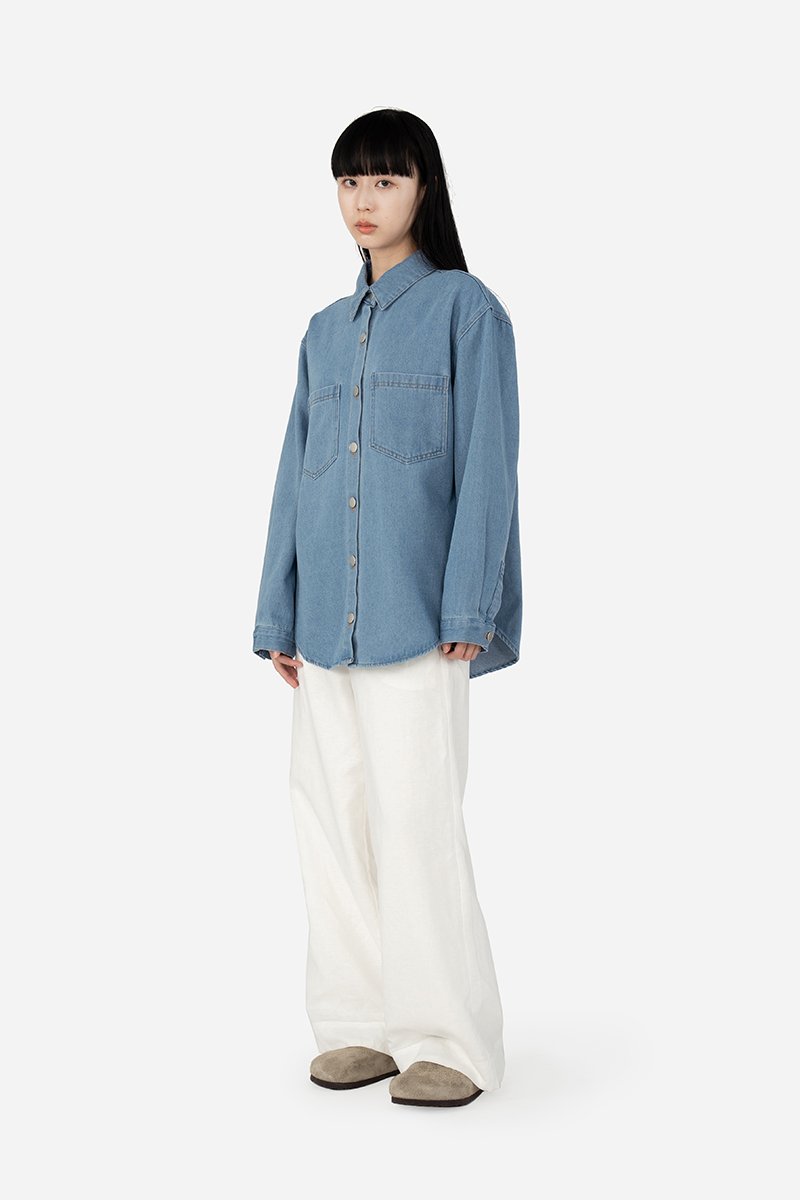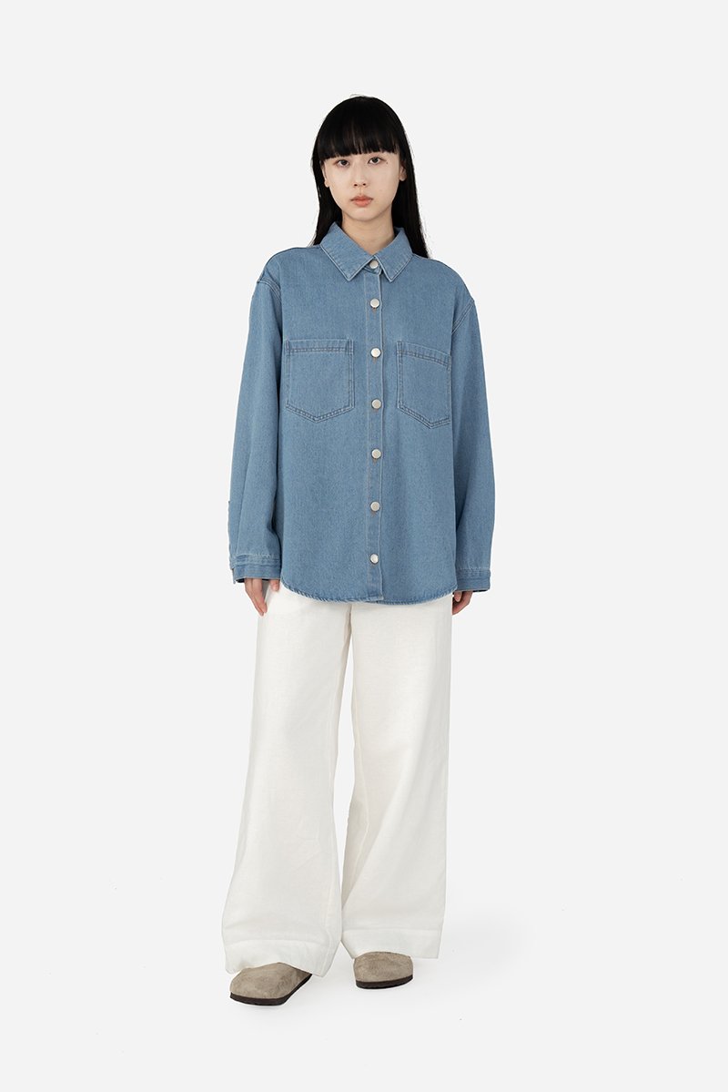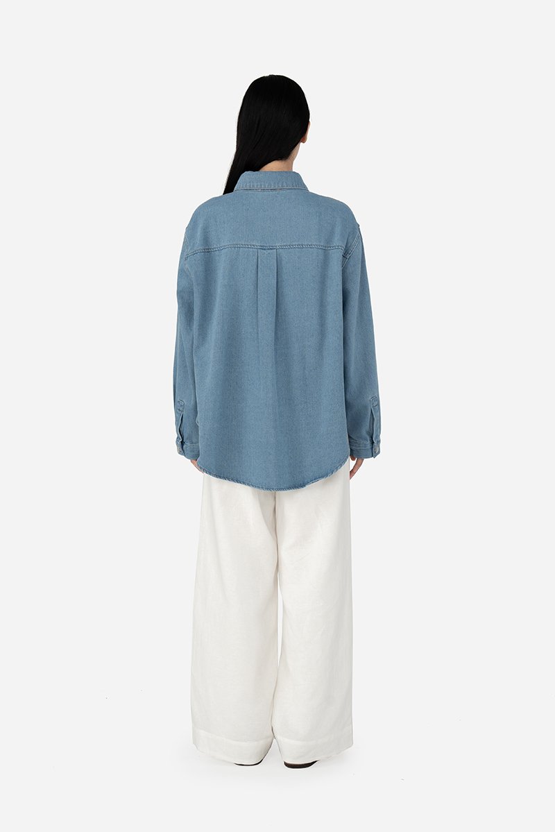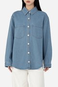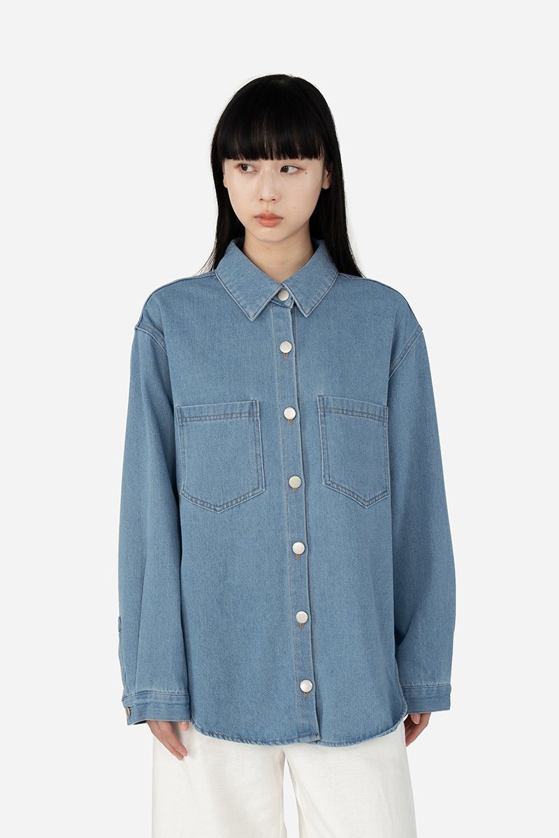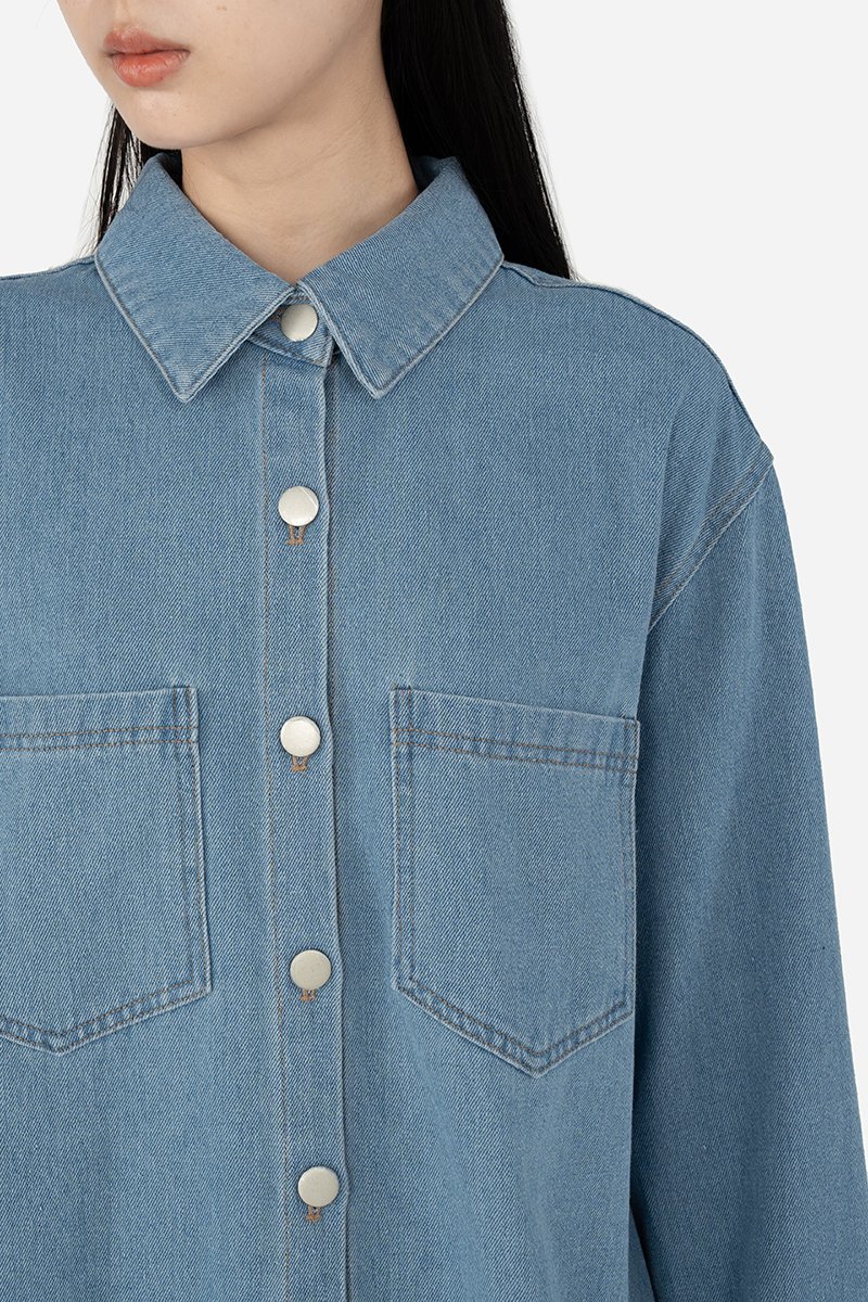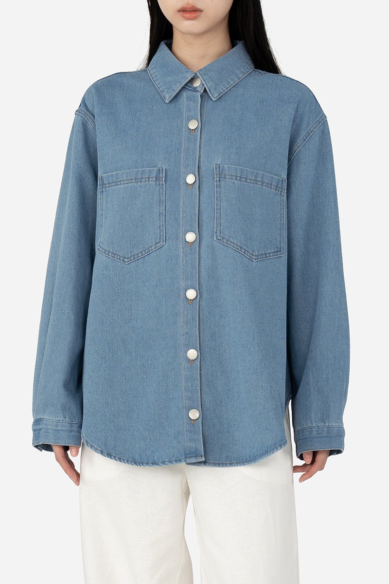 Effortlessly versatile, this oversized denim shirt is the perfect blend of comfort and style. Sawyer is a classic button-down design that features a standard collar, functional chest pockets, cuffed long sleeves and a curved hem, making it a timeless wardrobe staple great for layering. Crafted from cotton blend fabric, this unlined shirt can be paired with jeans for a double-denim look, or dress it down with shorts for a casual outing ensemble.