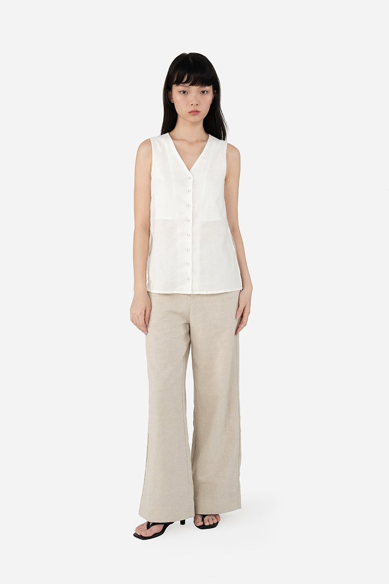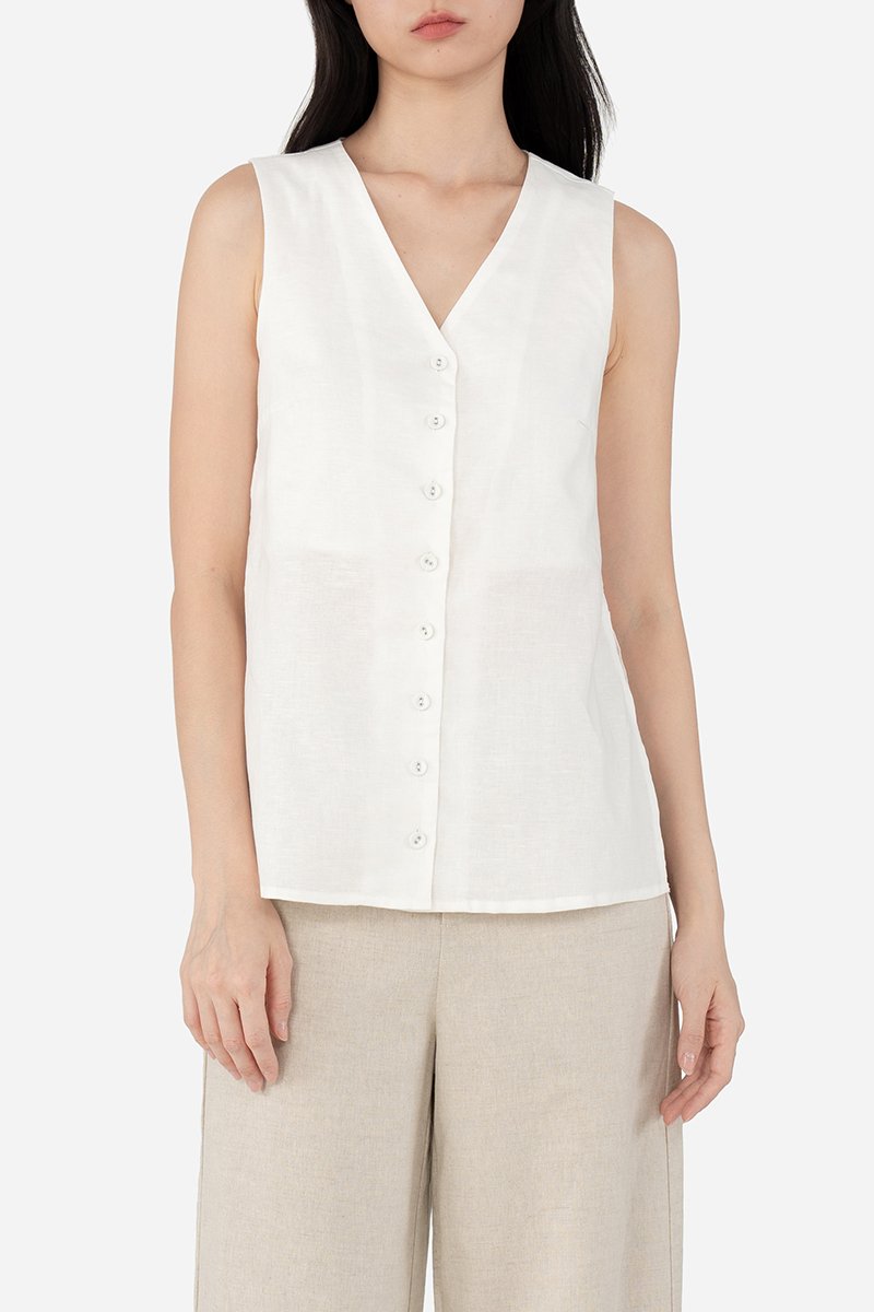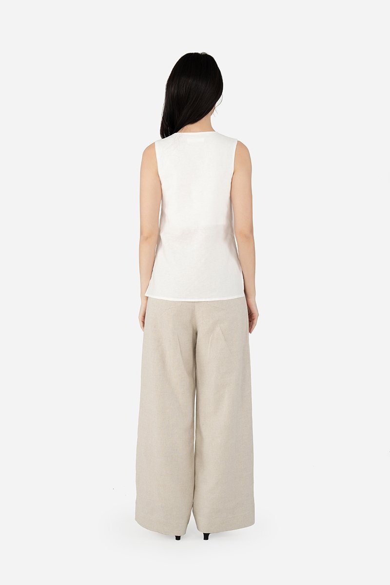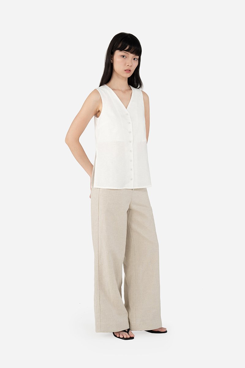 Think Carmen, but long-line. The Tate Top is a sleeveless design that features a flattering V neckline into a functional button down and a long-line silhouette that creates a chic streamlined look. Constructed from the same breathable cotton-linen fabric as Gallo, this piece is lined with a pure cotton lining to the symmetrical side slits that bring an edgy feel. Effortless to dress up by pairing with tailored trousers or a flowy skirt, Tate is a versatile wardrobe staple that exudes understated elegance.