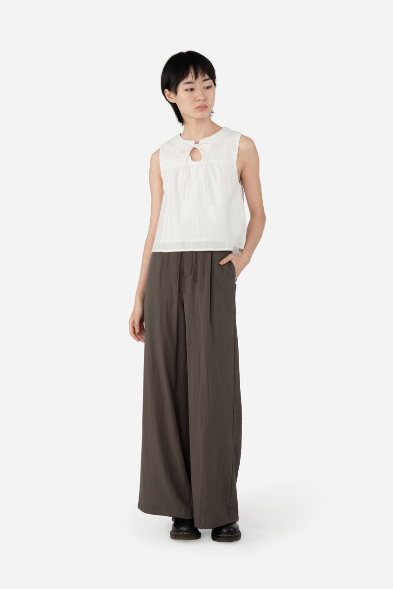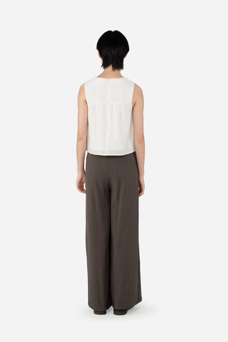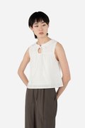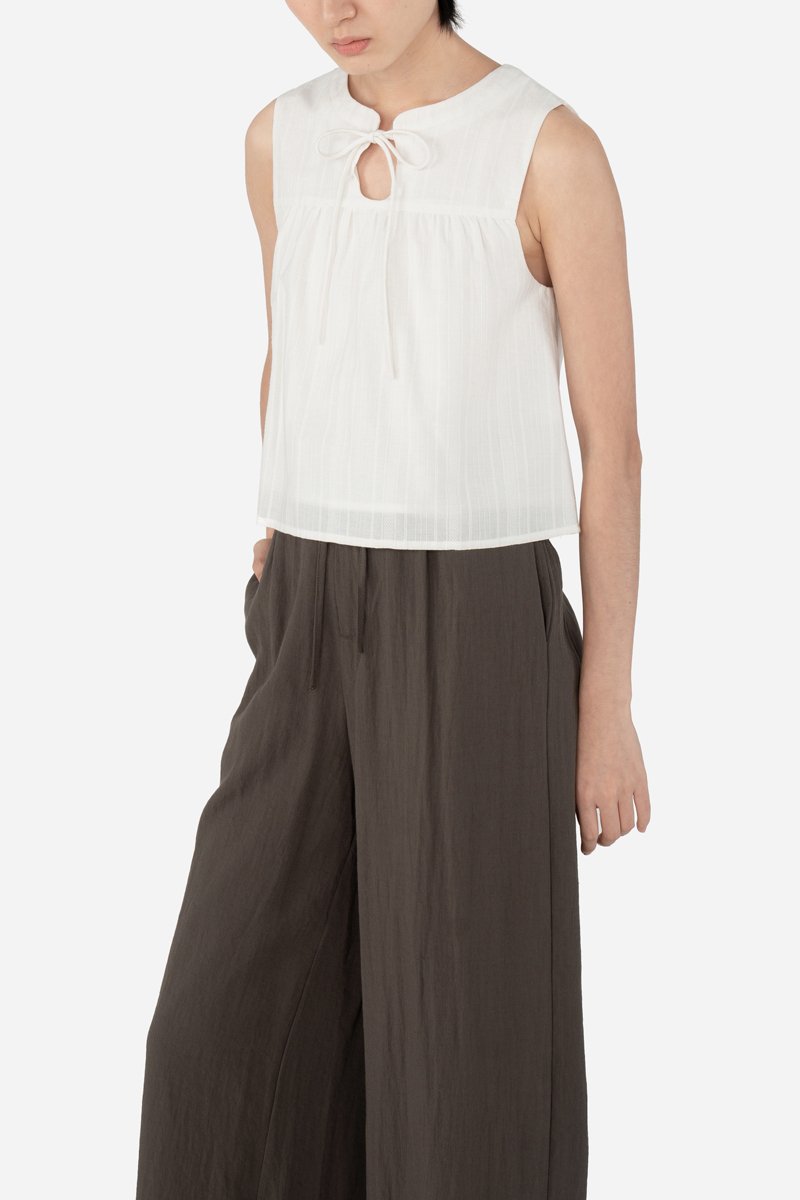 Elevate your everyday wardrobe with Xenia, a sleeveless top designed with delicate details and a flattering silhouette. Crafted from 100% cotton and fully lined in pure cotton, this top feels breathable and comfortable for all-day wear. It features a flat mandarin collar with a classic keyhole neckline, secured with a delicate frontal tie detail for a subtle accent. Gentle gathers across the front and back add dimension and movement, while a concealed zip at the back ensures ease of wear. Light and versatile, Xenia pairs effortlessly with your go-to bottoms for a refined yet relaxed look.