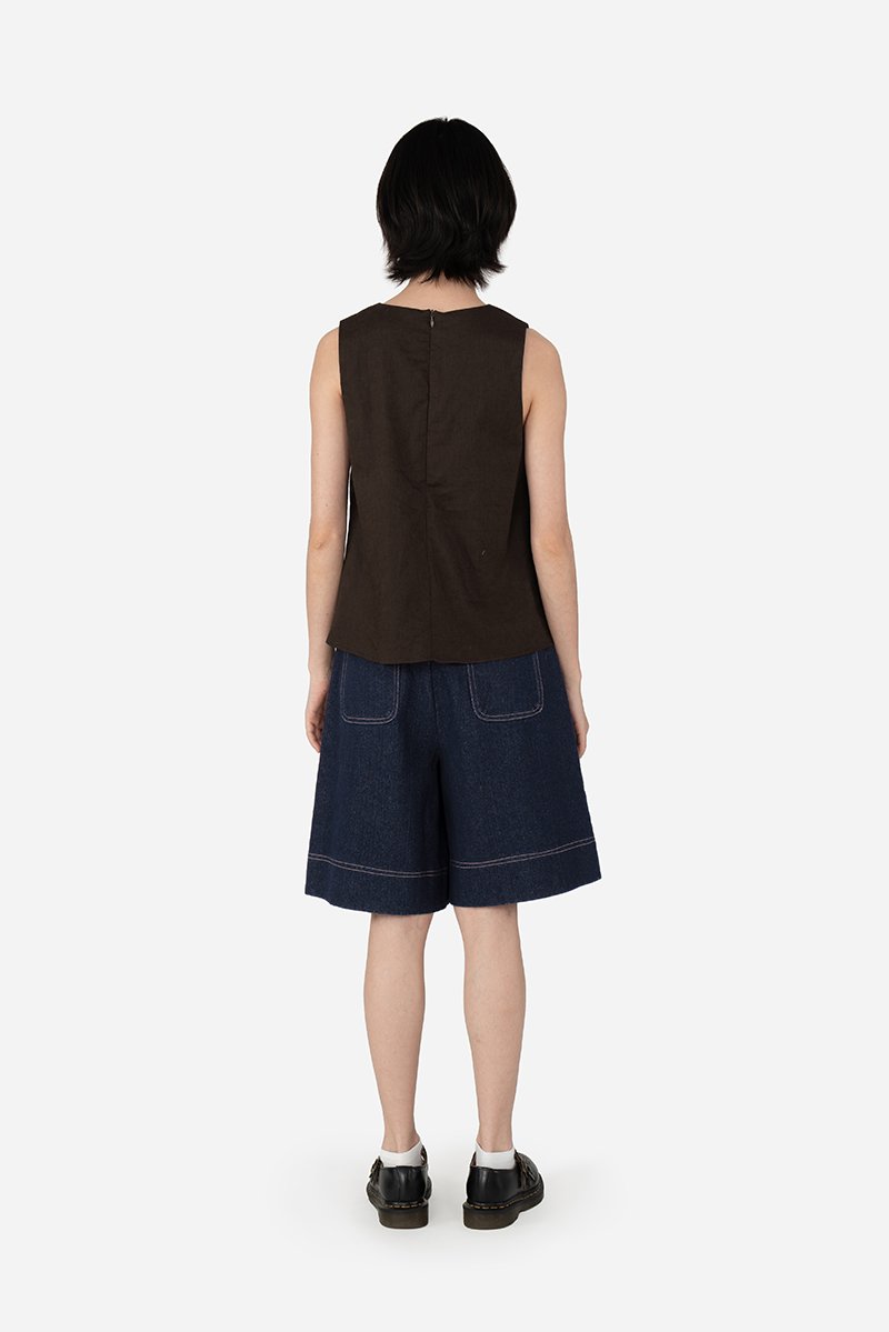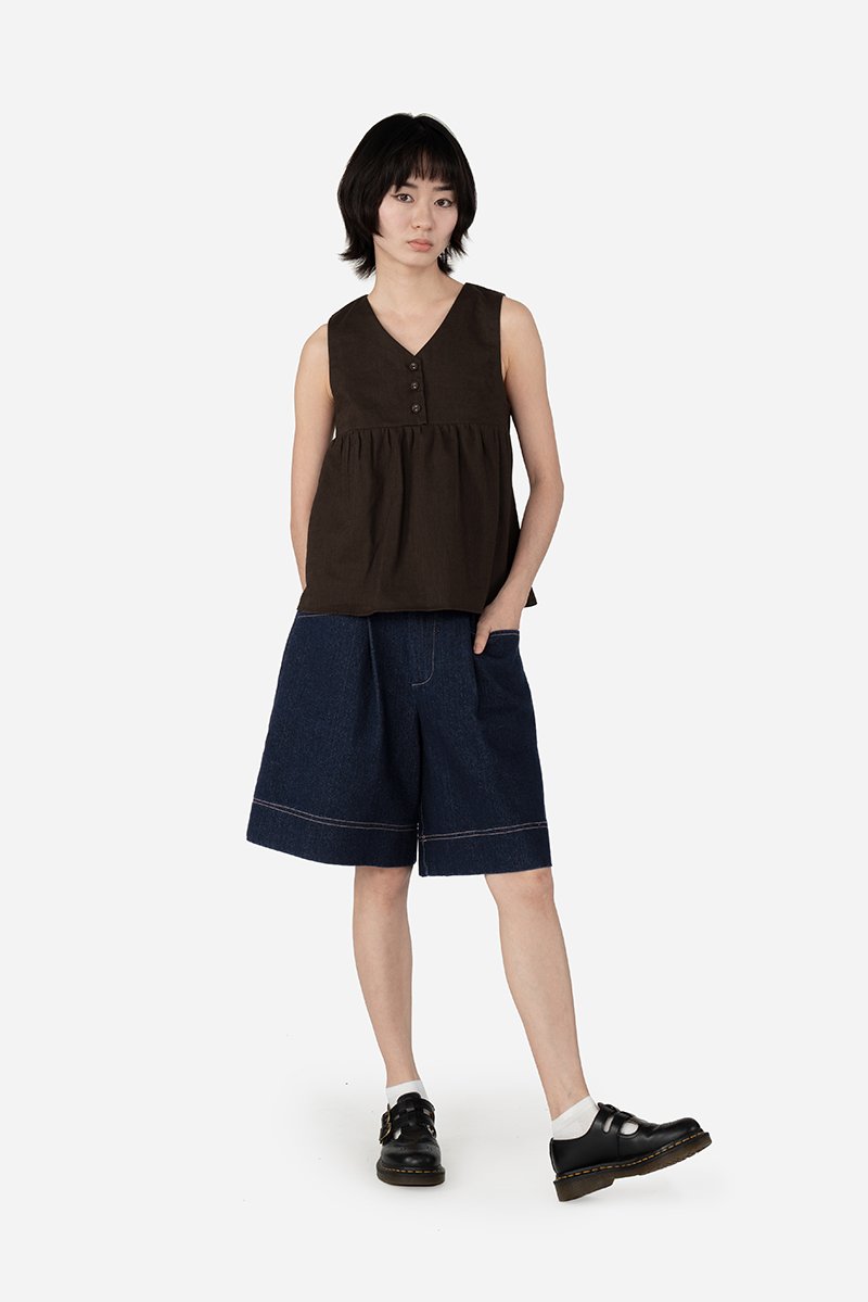Designed with a flattering V neckline, the Yufi Top is a sleeveless piece featuring a half button-down front and a gathered chest seam that adds gentle shape. Finished with a concealed back zip for easy wear, it’s crafted from cotton-linen fabric and fully lined with pure cotton for breathable comfort. Effortless in nature, Yufi is an easy addition to everyday dressing.
