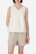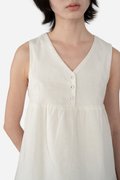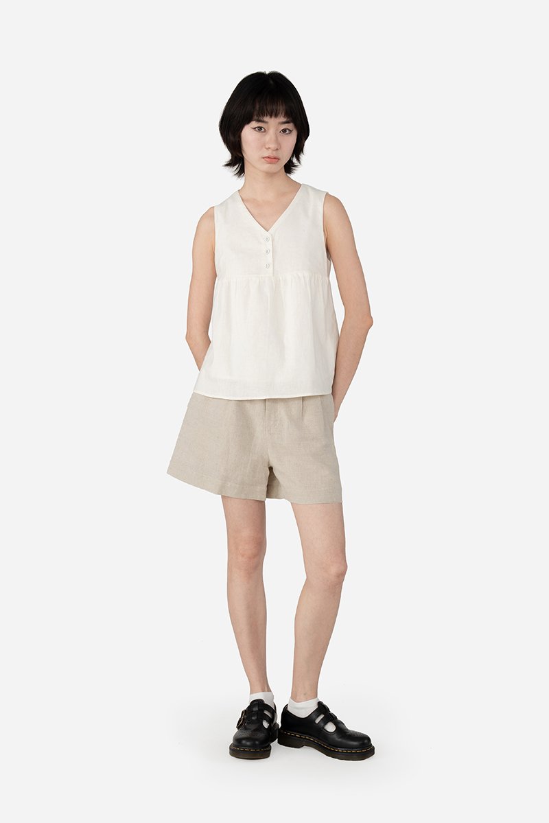 Designed with a flattering V neckline, the Yufi Top is a sleeveless piece featuring a half button-down front and a gathered chest seam that adds gentle shape. Finished with a concealed back zip for easy wear, it’s crafted from cotton-linen fabric and fully lined with pure cotton for breathable comfort. Effortless in nature, Yufi is an easy addition to everyday dressing.