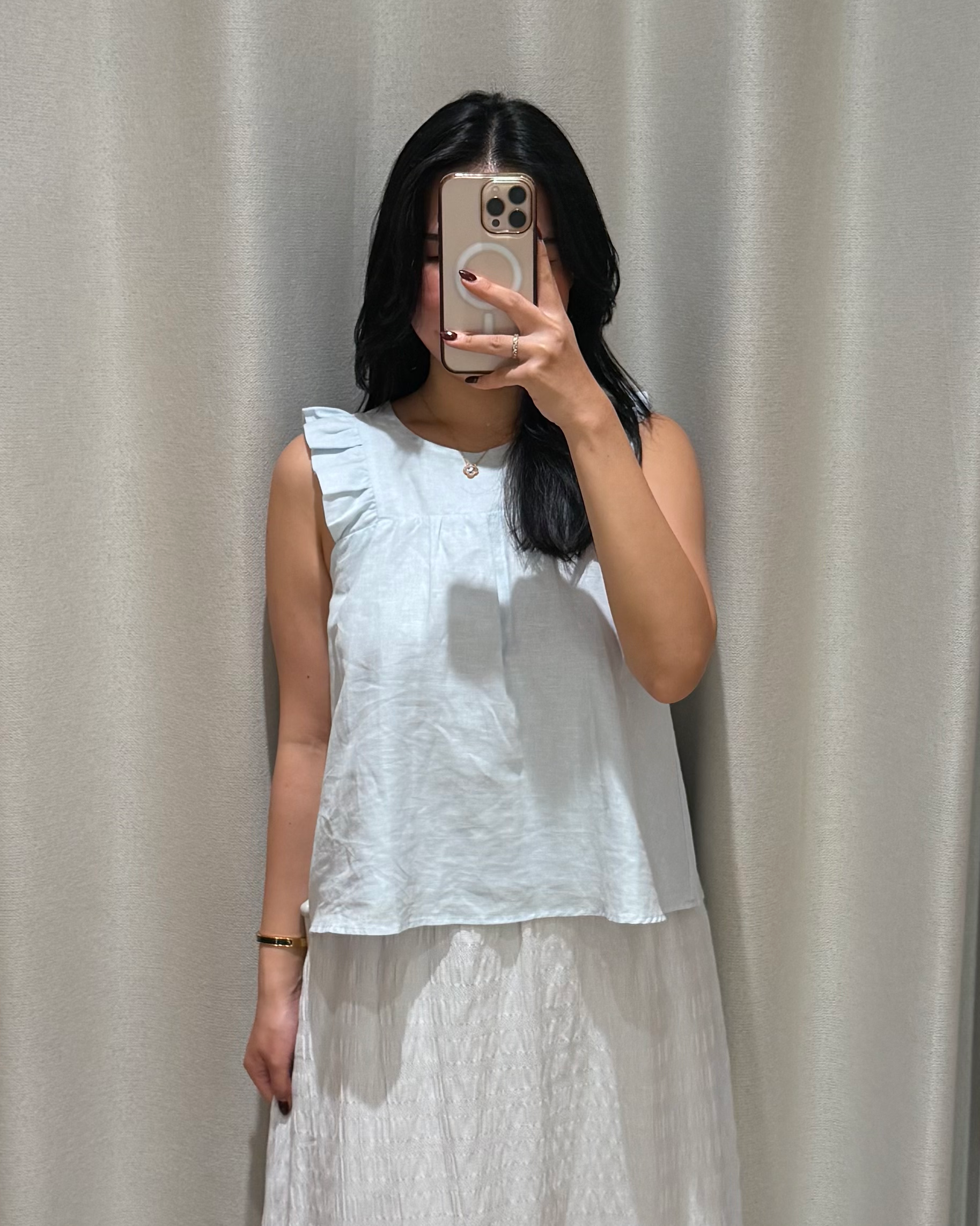 Sweet, and effortlessly demure, the Meridyn Top embodies graceful simplicity with a feminine flair. Soft ruffled armholes frame this sleeveless piece, while a subtle back button keyhole adds a refined finishing detail. Fully lined with a pure cotton lining, Meridyn is lightweight and easy to style with the same cotton-linen fabric bottoms such as Gallo, Watson and Verhana.
